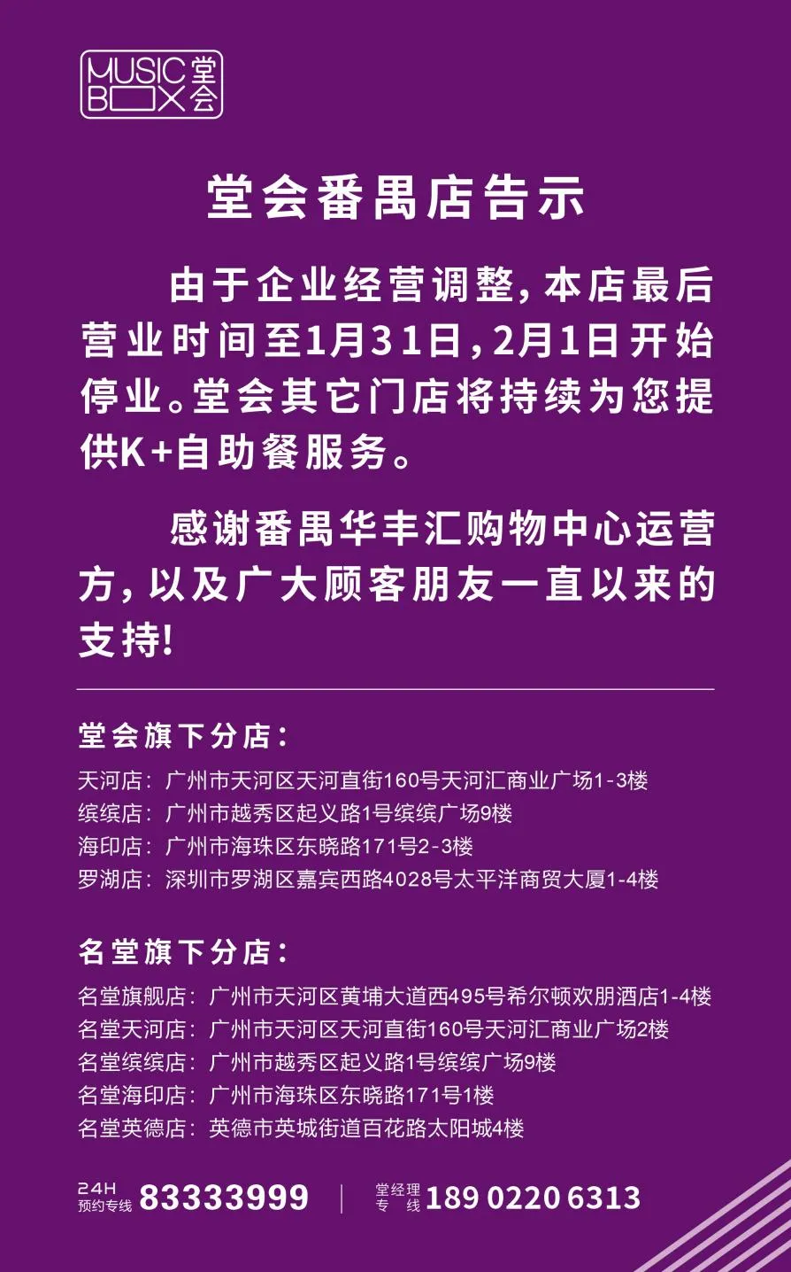 近日,堂会番禺华丰汇店正式发布结业告示宣布因企业经营调整,门店最后营业时间定为1月31日自2月1日起将全面停业;这一消息,宣告着这家扎根番禺12年的老牌KTV即将正式与街坊邻里告别。门店停业后,网上已办理的充值、团购等相关款项,将陆续安排退还,切实保障消费者的合法权益。来源:番禺融媒;