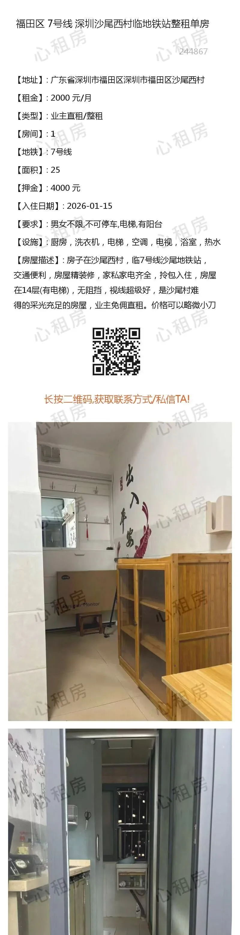 深圳租房>>福田区7号线深圳沙尾西村临地铁站整租单房2000元/月