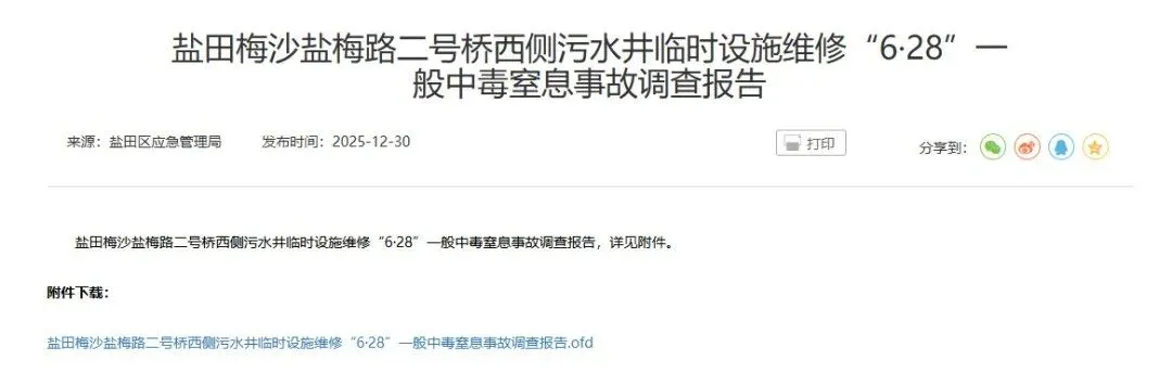 2025年6月28日凌晨2时50分许,在深圳盐田区梅沙街道一临时排水系统的污水井内,深圳市某环境工程管理公司2名工人在污水井下进行维修作业时,发生一起一般中毒窒息事故,事故造成1人死亡,1人受伤。截至事故调查报告完成之日,事故造成直接经济损失约183万元。