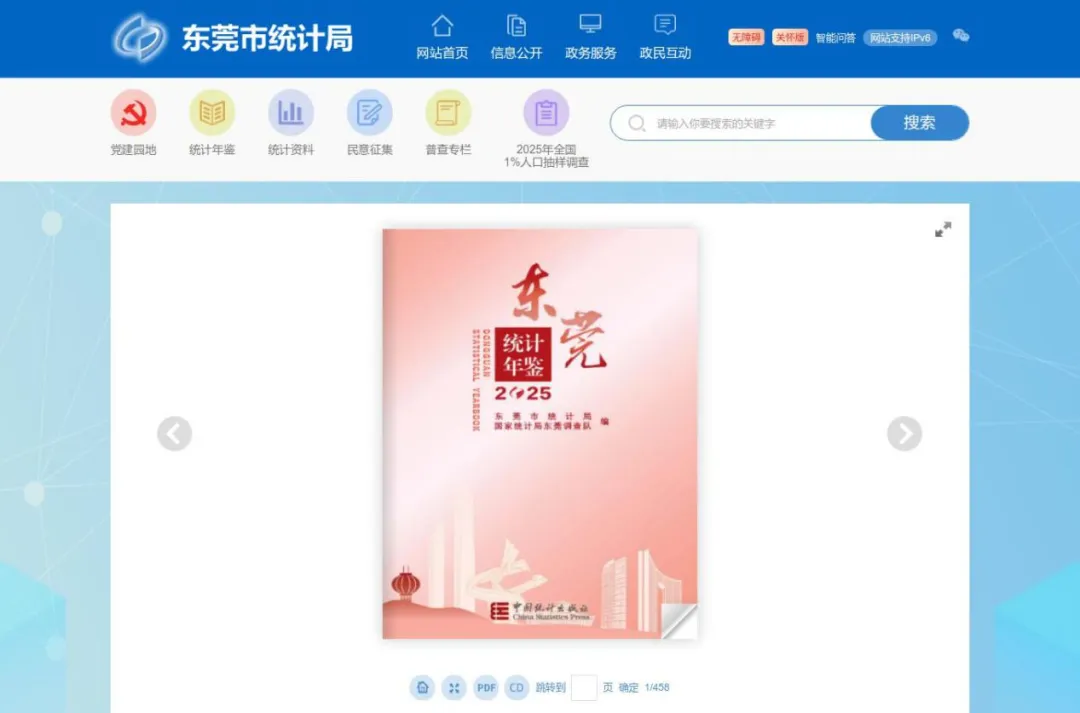 东莞市统计局官方网站是东莞统计数据发布的主要渠道,统计数据信息可通过网站的“数据发布”“统计年鉴”“统计资料”“信息公开”等栏目获得。