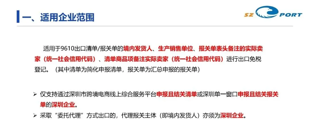 该政策目前主要面向以9610监管方式出口的深圳企业。适用于9610出口清单或报关单的境内发货人、生产销售单位,以及在报关单表头或清单商品项备注的实际卖家。
