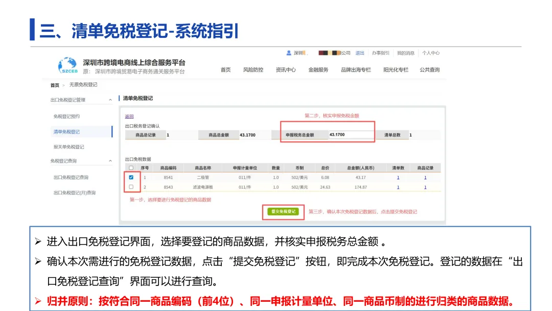 第三步:清单/报关单免税登记