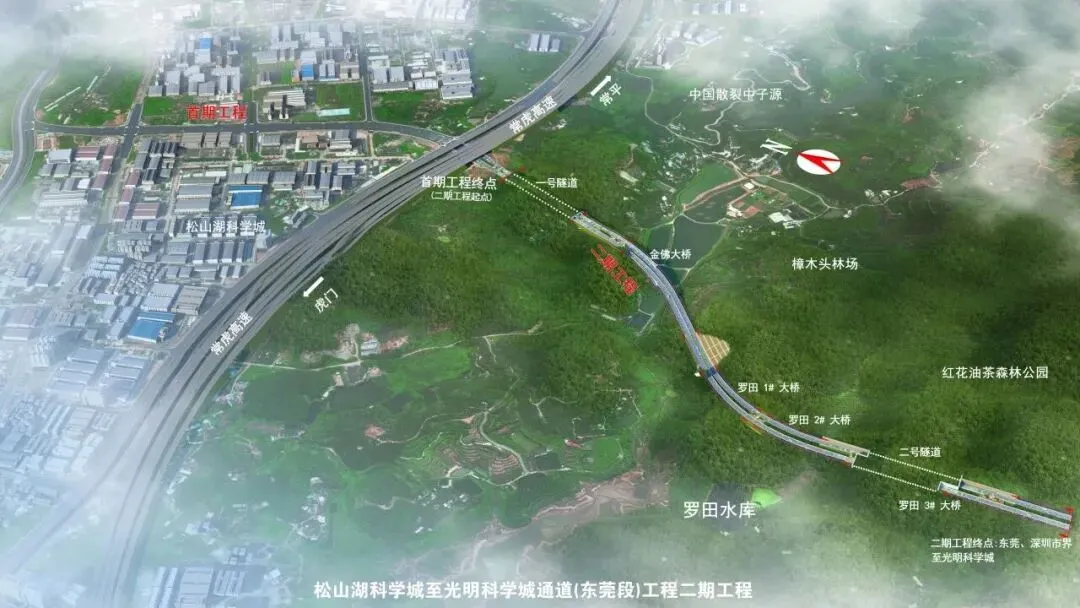 该项目起点顺接科学城通道首期工程,往西南以S形曲线穿越罗田水库现状物理隔离区、二级水源保护区及樟木头林场,终点至莞深交界处顺接深圳段南光快速北延,全线长约2.4km,力争2028年6月实现全面贯通,为深莞两地科学城协同发展搭建便捷交通桥梁。