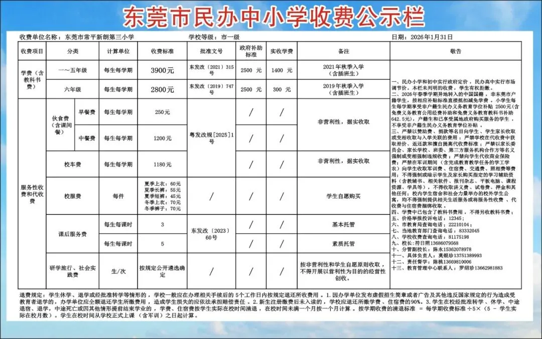 根据东莞市教育局《关于加强学校教育收费公示管理工作的通知》精神,现将东莞市常平新朗小学收费公示如下: