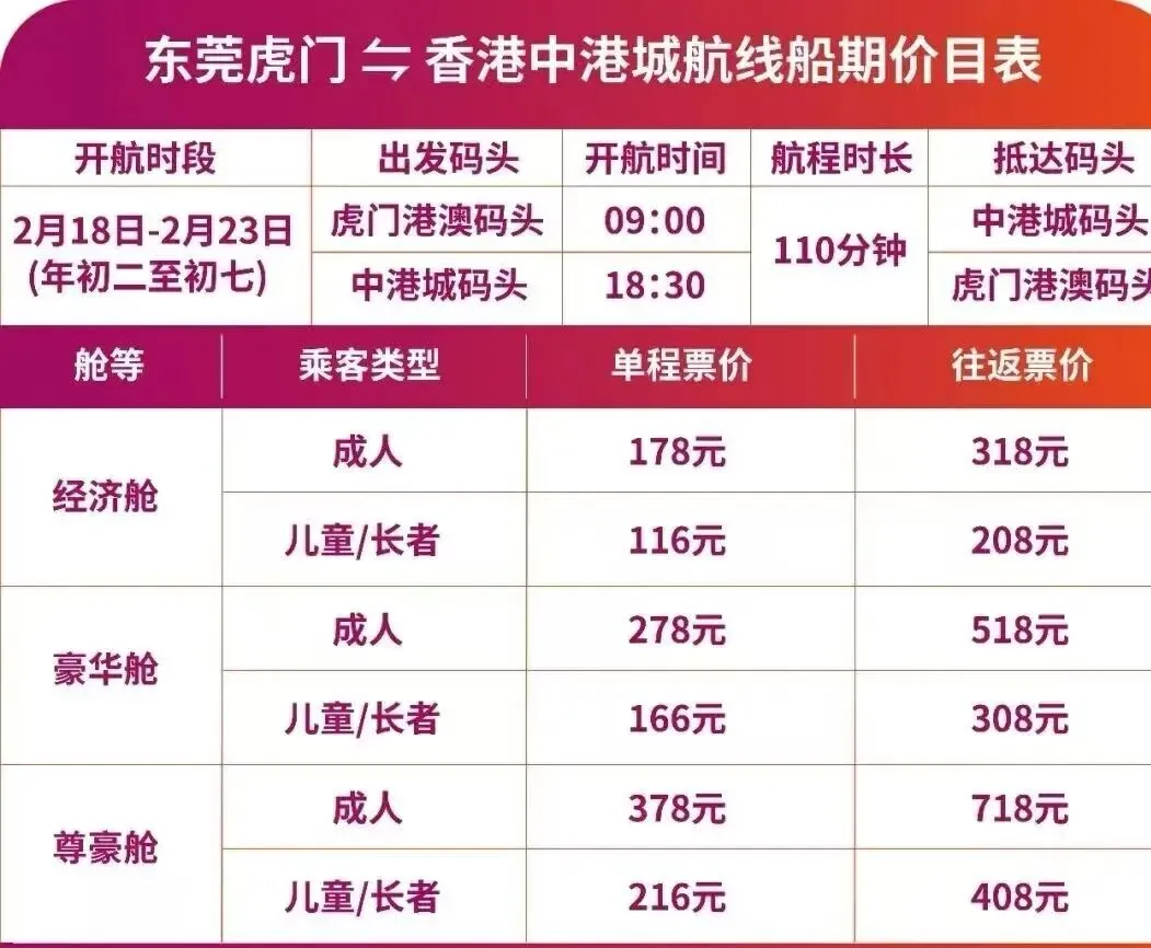 据了解,为满足春节期间莞港两地民众出行需求,进一步便利粤港澳大湾区人员往来,潮in虎门产业联盟商家虎门港澳客运码头将于2月18日(正月初二)至2月23日(正月初七)期间,增开往来香港中港城的高速客轮航线。