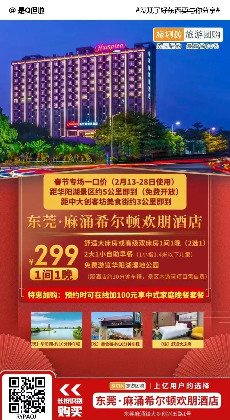 【东莞麻涌希尔顿欢朋酒店】春节专场一口价(2月13-28日使用)¥299住国际品牌!免费游览华阳湖景区(约10分钟车程即到)!