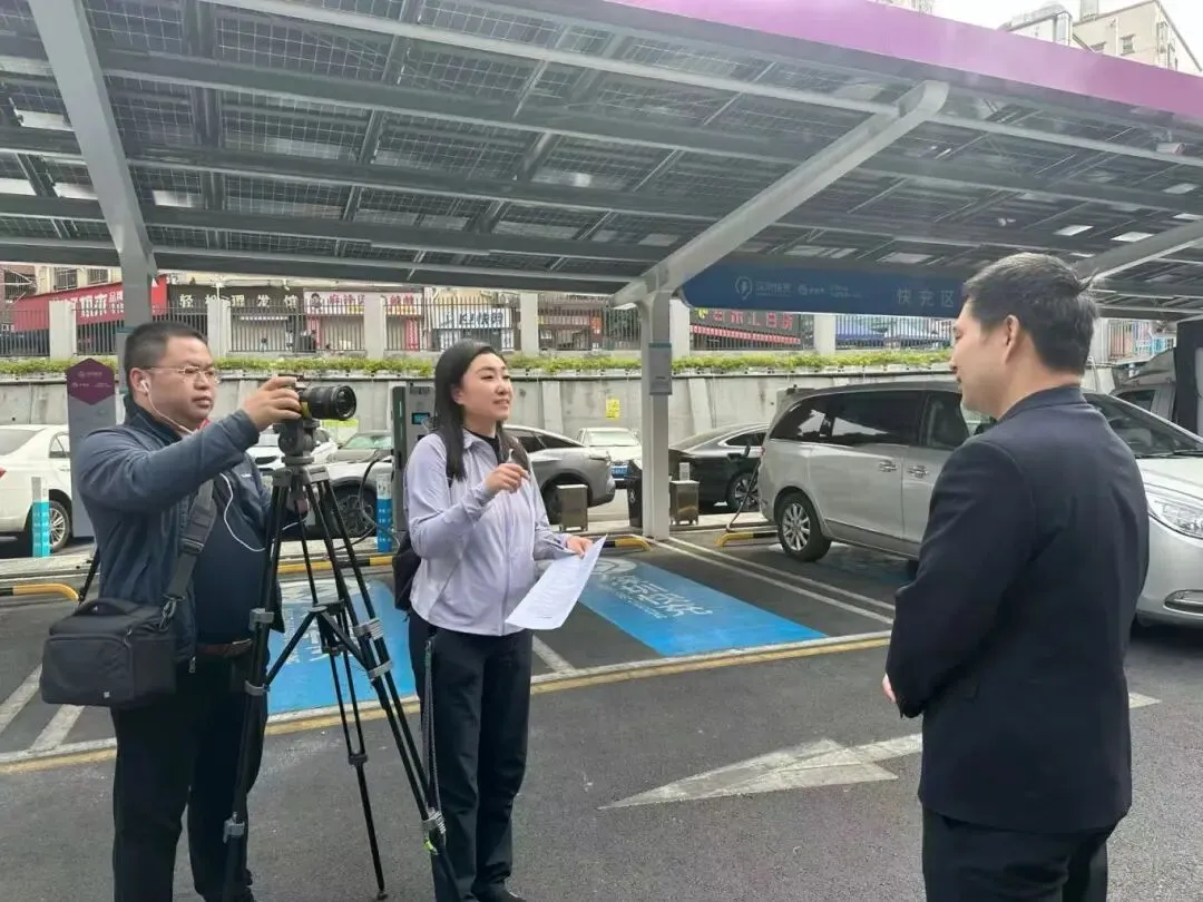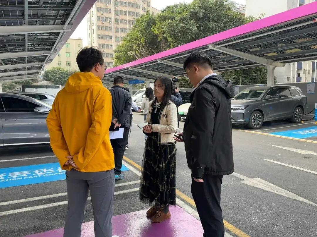 ▲一期项目建设后,新能源车超充站已投入使用,超充站的棚顶光伏和旁边厂房的屋顶光伏在阳光下熠熠生辉。(深圳供电局 供图)