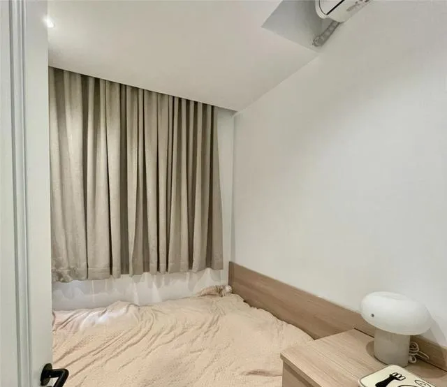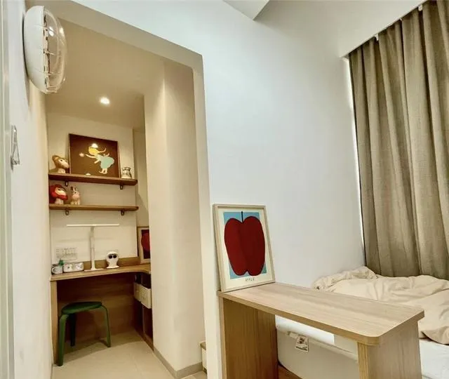 最绝的是两间小卧室的设计!原本户型里有根柱子,很多人觉得碍事,但人家反而把它变成了优势,沿着柱子做了学习桌,一直延伸到窗边,再配上地台式的单人床,空间利用率直接拉满!