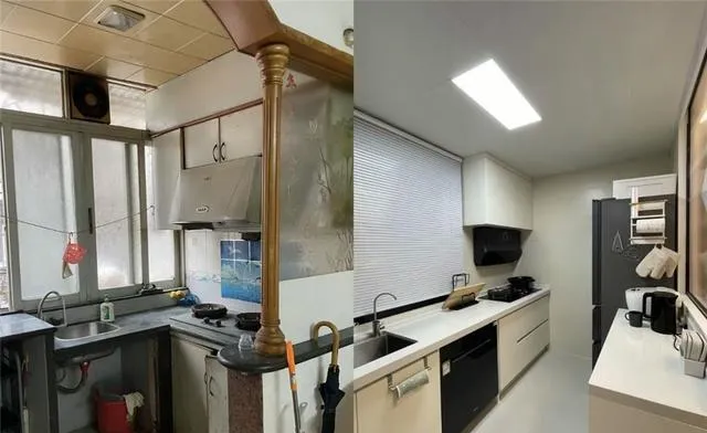 厨房的改造前后对比真的惊人!原来的L型橱柜又旧又挤,改成双一字型布局后,动线顺畅多了,洗菜、切菜、炒菜一气呵成,做饭效率都提高了。