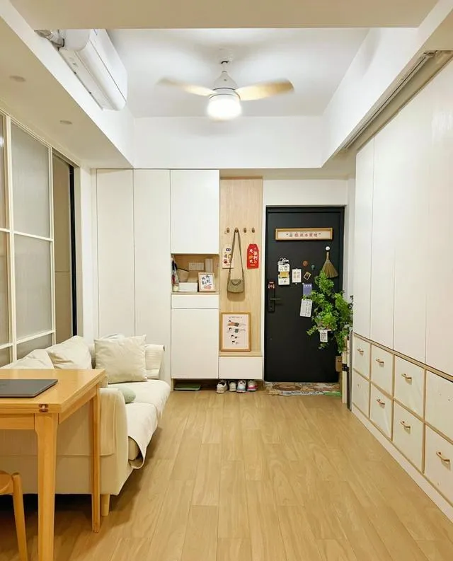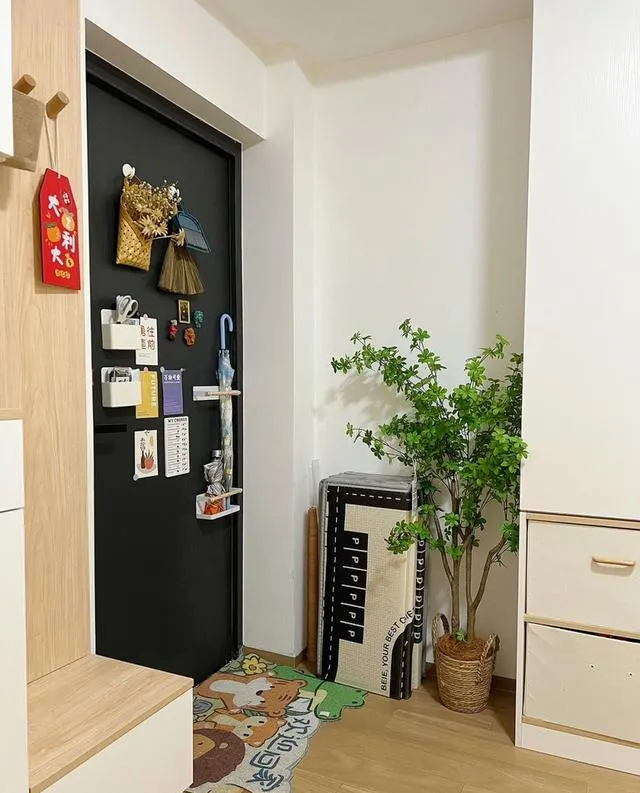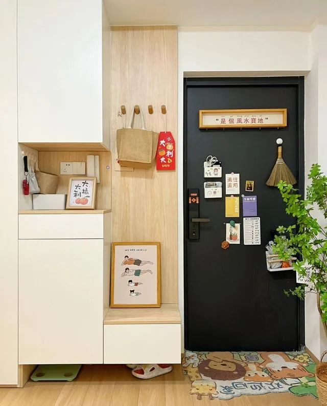 你瞧,这玄关一眼就让人心软!原木色和白色搭配,门口挂了几个实用小挂钩,便利贴、祝福符、钥匙包挂得井井有条。鞋柜留了悬空,扫地机器人和拖鞋都能安身。进门的小地垫上还有卡通小动物,是不是特别有烟火气?有人说,“家,就是这些琐碎细节拼在一起的温暖。”墙上钉子、柜中收纳,全是细致入微的小巧思——