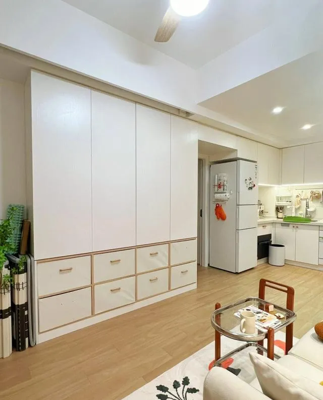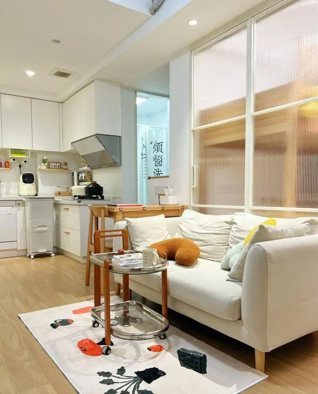 别看面积紧凑,人家硬是把厨房搬到了原来的餐厅位置,做了一个开放式,明亮又宽敞。客厅和儿童房用长虹玻璃移门隔开,既保证了私密性,还让光线洒进来**,一点都不压抑**。全屋定制柜子,收纳空间不要太多,难怪网友感叹:“这收纳量,羡慕哭北方大平层了!”
