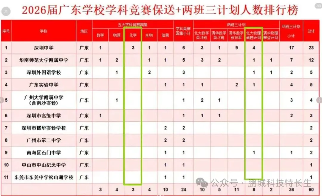 02 标准变革清北选拔竞赛生的标准正在发生根本性转变。过去,他们可能更青睐在单一学科上表现极端突出的“I型”专才,如今则明显转向青睐 “T型”人才——即不仅要有扎实的学科深度,更要有宽广的综合素养。这种变化体现在选拔的各环节:2026年起,即便是进入国家集训队的顶尖选手,清北也增设了笔试和面试环节。在北大物理卓越计划的测试中,语文和英语科目需同时达到50分合格线才能进入下一环节,不止一位物竞金牌选手因此被淘汰。清华北大甚至将“现学现考”环节升级,北大数学英才班的测试直接使用两本纯英文的专业教材,要求学生在极短时间内消化全新的高深数学概念,并用英语进行学术思考。03 深圳赛道的竞争要进入“两班三计划”的竞技场,深圳学生首先要闯过的是高中自主招生这一关。以深圳“四大”高中(深圳中学、深圳实验学校、深圳高级中学、深圳外国语学校)为代表的头部学校,其自主招生录取竞争已白热化。这些学校拥有深圳最优质的教育资源,其清北录取人数占全市八成以上,特控率普遍超90%。然而,录取率却在逐年收紧。近年来,十大高中的录取比率已从10.57%下滑至6.77%,进入四大的比例更是被拉低到约3%。录取分数线令人望而生畏。根据近年的得分率分析,考生需要所有科目(含体育)总分得分率在93%以上,才有机会考入四大。也就是说,以2025年中考满分610分计算,最多只能丢50分。而2026年深圳中考总分将上调至630分,这意味着竞争基准再次升高。根据深圳市教育局的政策,高中阶段学校的自主招生计划原则上控制在学校年度招生计划的10%以内。2025年深圳“四大”高中的自主招生占比均已超过20%,其中深中和深外的自招占比甚至超过了1/4。04 从初一开始的规划面对“T型人才”的选拔标准和深圳头部高中激烈的竞争环境,传统“初三发力”的思路已经失效。系统性的竞赛和学业规划需要前置到初一。深圳市从2026年起参加中考的学生(即2023年秋季入学的七年级学生),将面临新的初中学业水平考试方案。除语文、数学等主科外,物理、化学实验操作将独立计分,各占10分。这意味着从初中起始年级开始,学生就需要全面均衡发展,不能有丝毫短板,因为任何一科的细微差距,在得分率要求超过93%的竞争中,都可能是决定性的。学科竞赛的准备更需要长期投入。要最终在高中阶段达到“两班三计划”所需的竞赛水平,初中阶段打下扎实的学科基础、建立竞赛思维至关重要。此外,综合素养,尤其是语文和英语能力,需要从初一就开始重视和积累。05 家长的行动清单面对复杂的升学环境,家长需要成为一个清醒的规划者。密切关注深圳市教育局发布的官方政策是第一要务。同时,家长要理性分析孩子的特长与兴趣,切勿盲目跟风。及早培养孩子的综合素养,特别是语文和英语的深度阅读与表达能力,这是在“T型人才”选拔中不可或缺的“一横”。积极了解深圳各大高中的培养特色,特别是其竞赛培养体系、师资力量和往届升学数据,为目标制定提供参考。在孩子进入初中后,逐步明确以竞赛为导向还是以综合发展为导向的路径,并在初中三年中动态调整策略,但始终要记住:深度与广度必须并行发展,缺一不可。在2026年深圳高级中学提前锁定清北资格的4名学生中,有人已经入选国家集训队并获得保送资格,有人则通过清华数学英才班、物理攀登计划和北大物理卓越计划走向顶级学府。这些学生的初中老师或许还能清晰记得他们在初一课堂上对数学难题的执着眼神,或是物理实验中的专注表情。在通往“两班三计划”的路上,没有一夜成名的奇迹。当他们的名字最终出现在清北录取名单上时,那条从初一延伸而出的轨迹才真正显现。