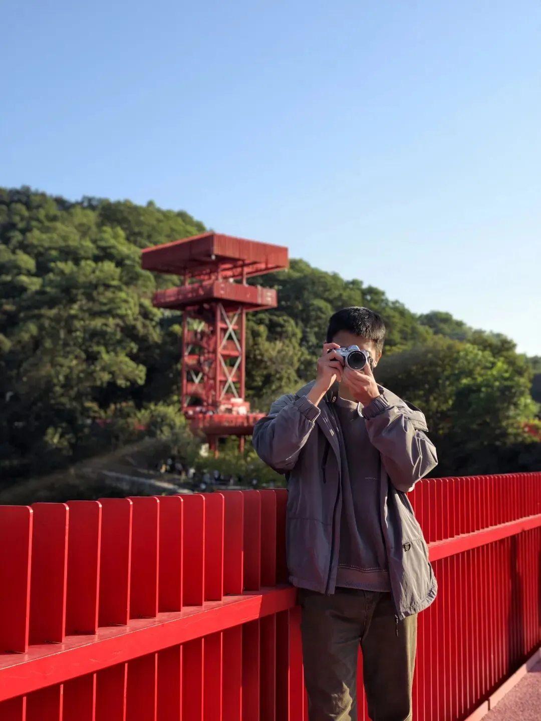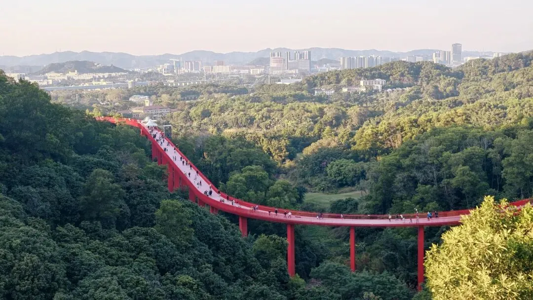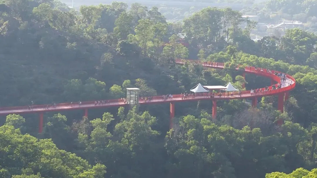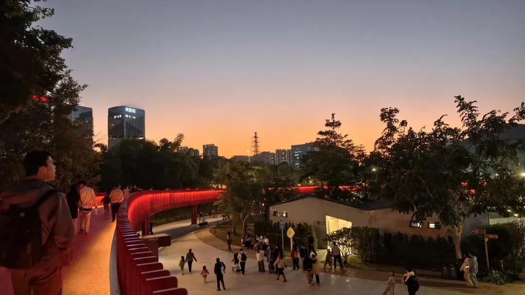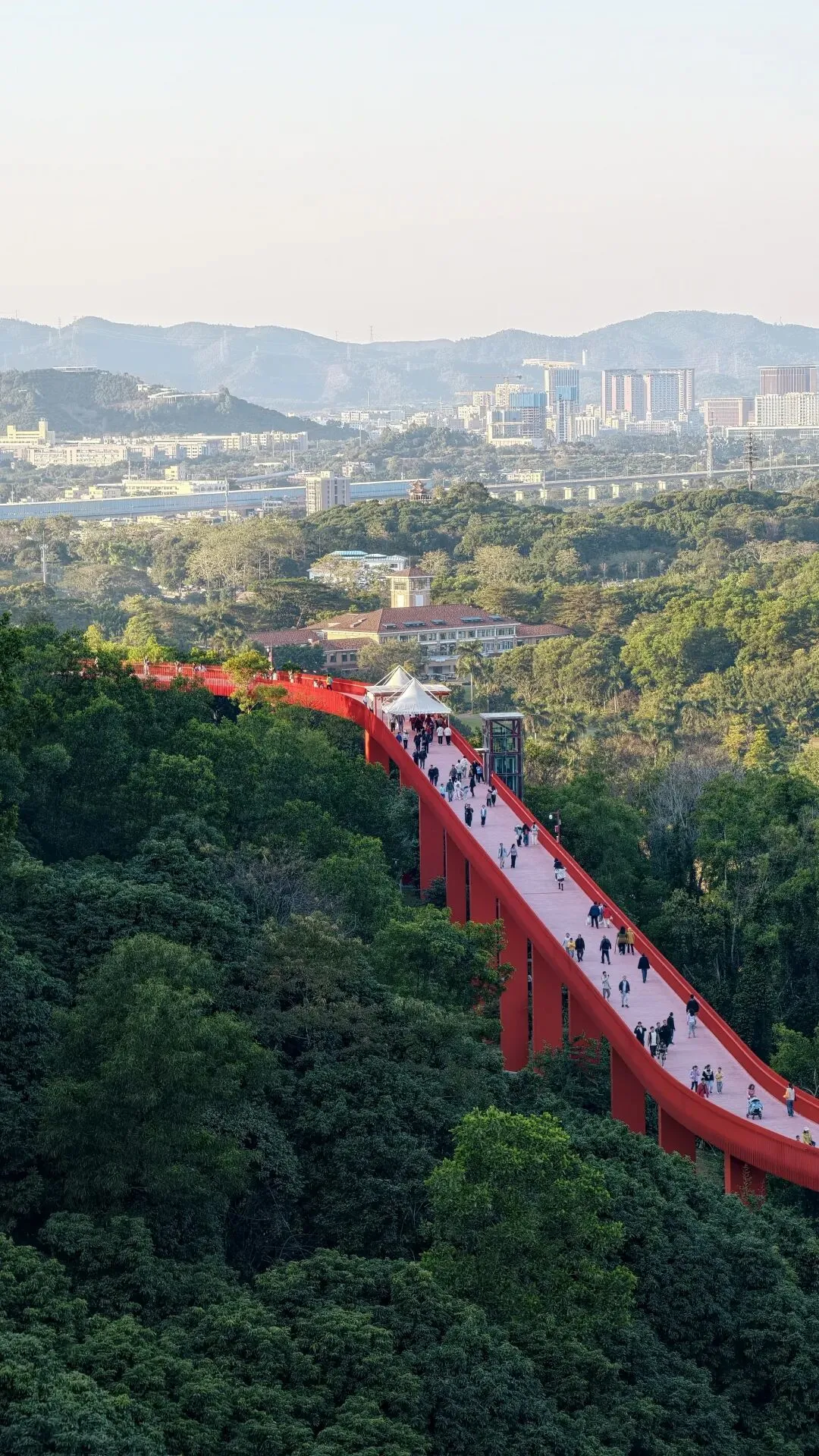 我真的很喜欢深圳,喜欢这座藏山纳海,融城于自然的城市,深究其因,大抵是五行同频共振的缘故吧。我五行喜“木”“火”,深圳的五行以火为主导,兼水、木为重要辅弼,整体呈“水火既济、木火相生”的复合稳定格局。漫步深圳户外,总能清晰感受到自然能量场的包裹与滋养,身心都觉舒展安宁……天气好到相机原图直出即可(奥巴的色彩真的很耐看),虹桥通体“中国红”的配色非常抓人眼球,设计极具辨识度,桥体蜿蜒曲折在绿林之间,漫步其中自在惬意~这是我们直奔的一个节点,虹桥公园的标志性建筑,也是整个4公里虹桥的核心制高点--光明塔。