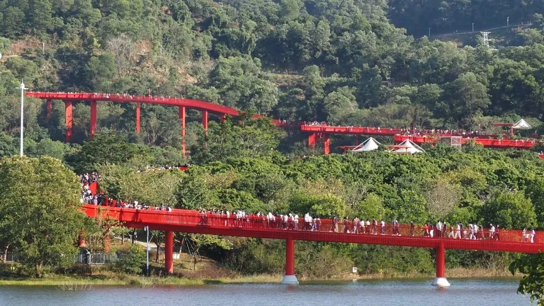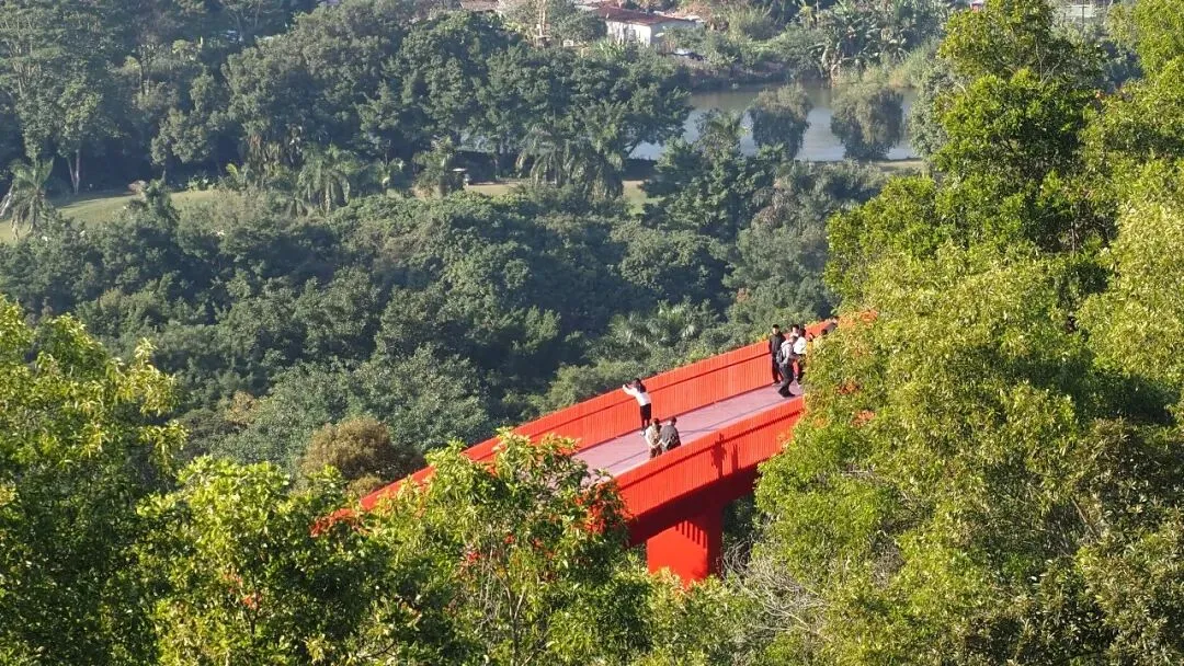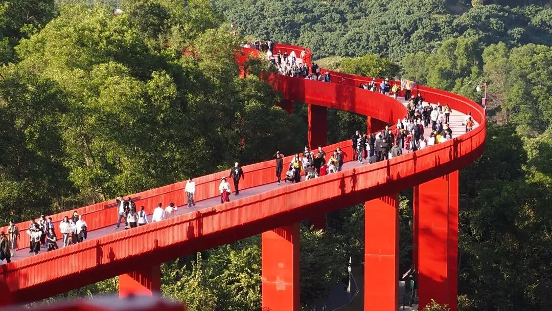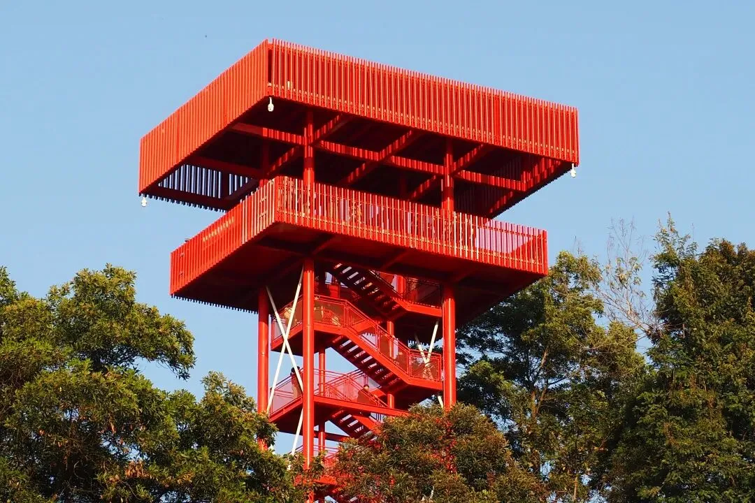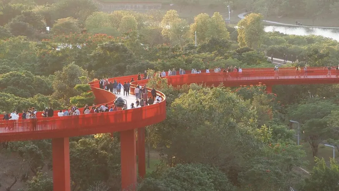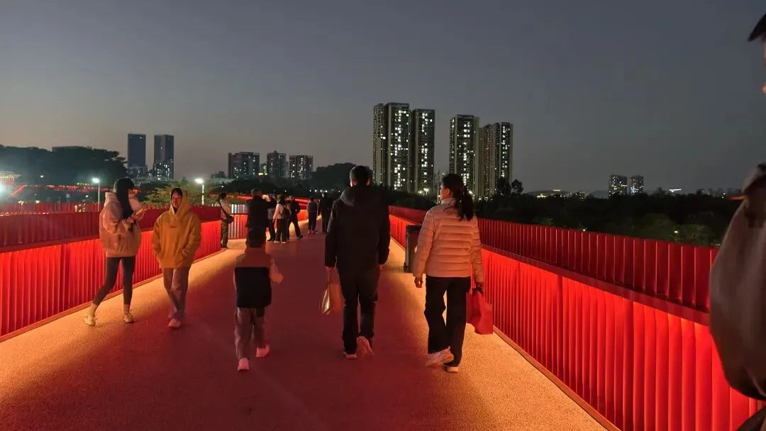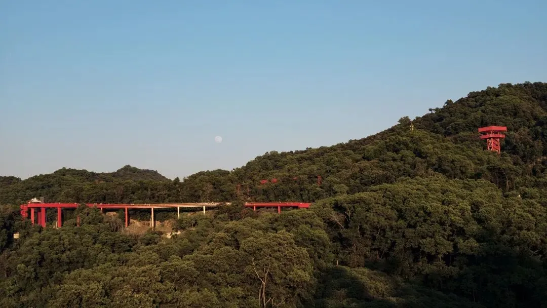 我真的很喜欢深圳,喜欢这座藏山纳海,融城于自然的城市,深究其因,大抵是五行同频共振的缘故吧。我五行喜“木”“火”,深圳的五行以火为主导,兼水、木为重要辅弼,整体呈“水火既济、木火相生”的复合稳定格局。漫步深圳户外,总能清晰感受到自然能量场的包裹与滋养,身心都觉舒展安宁……天气好到相机原图直出即可(奥巴的色彩真的很耐看),虹桥通体“中国红”的配色非常抓人眼球,设计极具辨识度,桥体蜿蜒曲折在绿林之间,漫步其中自在惬意~这是我们直奔的一个节点,虹桥公园的标志性建筑,也是整个4公里虹桥的核心制高点--光明塔。
