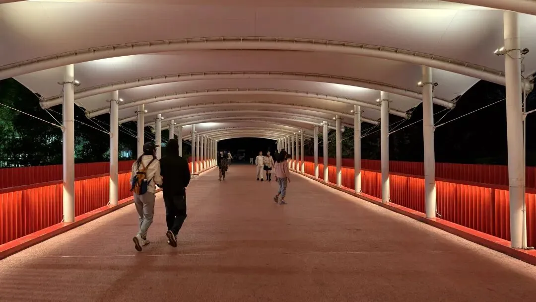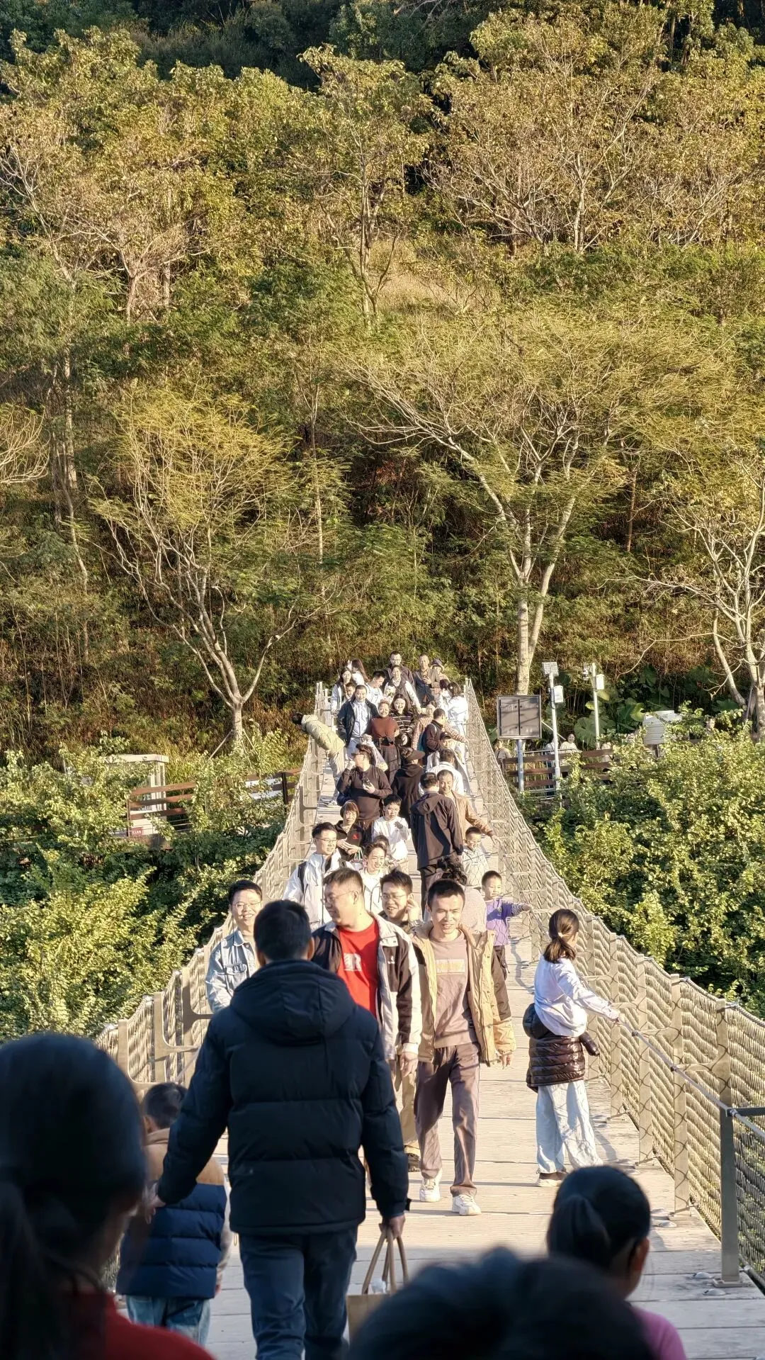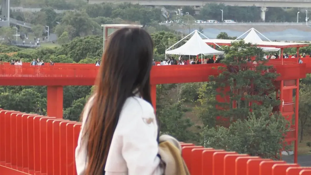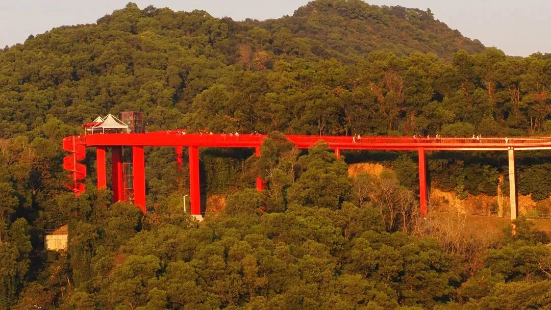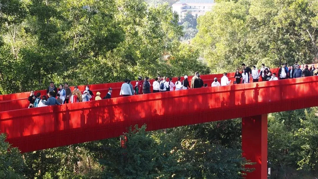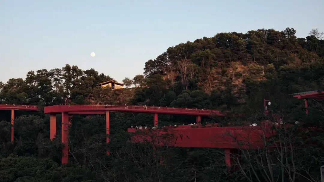 我真的很喜欢深圳,喜欢这座藏山纳海,融城于自然的城市,深究其因,大抵是五行同频共振的缘故吧。我五行喜“木”“火”,深圳的五行以火为主导,兼水、木为重要辅弼,整体呈“水火既济、木火相生”的复合稳定格局。漫步深圳户外,总能清晰感受到自然能量场的包裹与滋养,身心都觉舒展安宁……天气好到相机原图直出即可(奥巴的色彩真的很耐看),虹桥通体“中国红”的配色非常抓人眼球,设计极具辨识度,桥体蜿蜒曲折在绿林之间,漫步其中自在惬意~这是我们直奔的一个节点,虹桥公园的标志性建筑,也是整个4公里虹桥的核心制高点--光明塔。