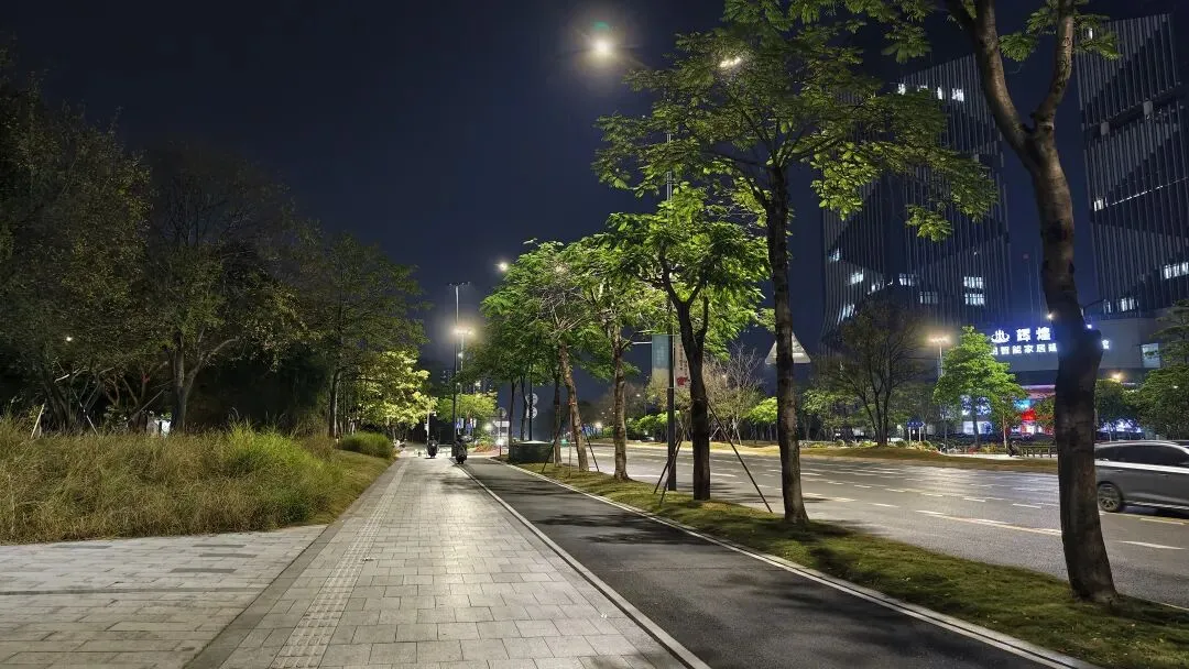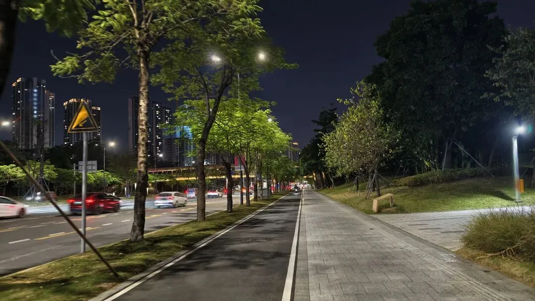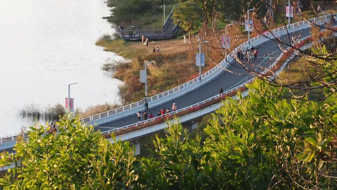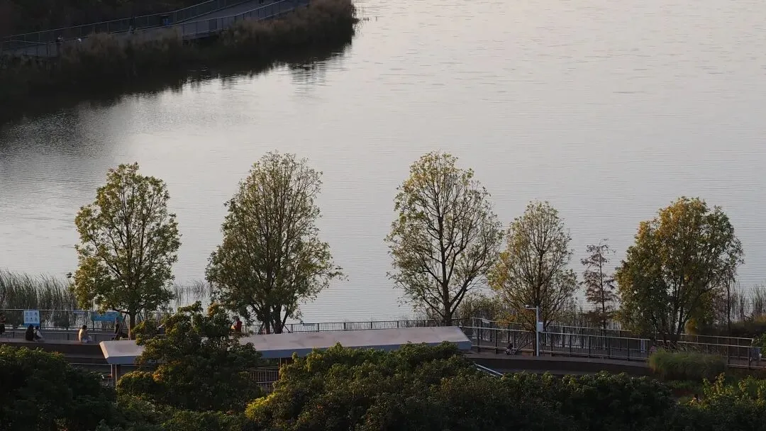 在虹桥上边走边往远处看,是一片对眼睛很友好的绿树及大草坪~发现一棵很可爱的独树,镜头拉长再拉长。萌萌的,像电影🎬场景一样。来到了大顶岭绿道特别有趣的网红悬浮桥,穿着厚底洞洞鞋的我费了不少劲爬坡上去的,在此之前没多久,膝盖不小心摔了,火辣辣的疼。好家伙,上来一看,结果发现居然是“石块”铺就的!也是震撼到我了,久久不敢相信!怕怕的又赶紧跑了。写文时边查才发现,哦,原来是浅灰色的防滑钢板材质,仿石纹的质感处理,难怪会误认为是石头了……往前走,随着斜阳下坠,我视线所及之虹桥,均已被温柔暖光浸染。这是一小片被牵牛花(五爪金龙)缠绕绞杀的树,天色暗又远看不大清但据枝干纤细扭曲的特点判断是小叶紫薇。牵牛花绞杀了小叶紫薇,藤蔓凭借小叶紫薇的枝干疯长,织成了一片紫雾。总是会被树的姿态、疏密错落的枝叶吸引就忍不住按下快门,在我眼里它们皆是鲜活的生灵。光明的车道很干净,划分得也很好,空气清新,走去吃饭的路上,结束🔚意犹未尽的一天。(主打一个拍了照片绝不浪费!)