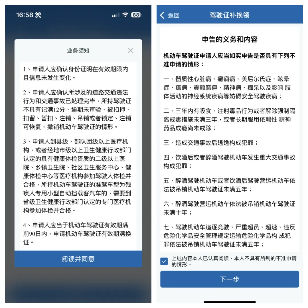 4、仔细阅读【业务须知】和【申告书】,点击“阅读并同意”,进入“下一步”;