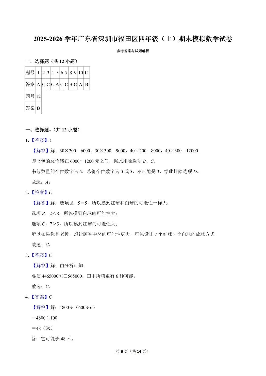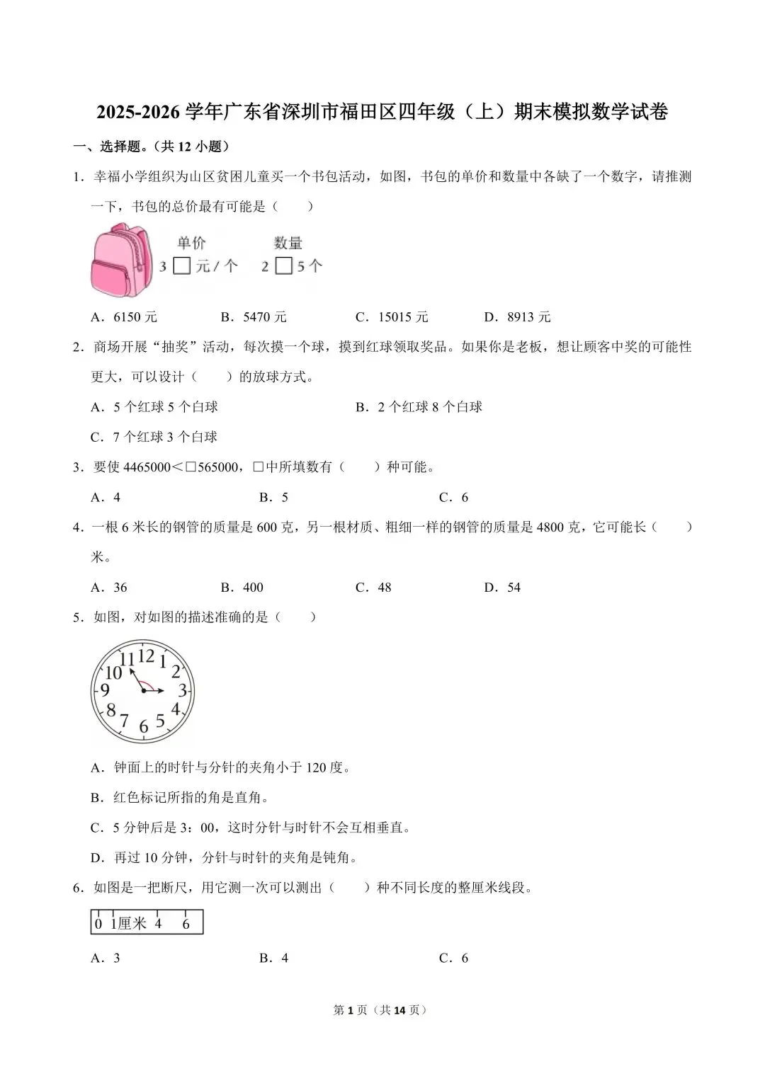 2025-2026学年广东省深圳市福田区四年级(上)期末模拟数学试卷及答案解析
