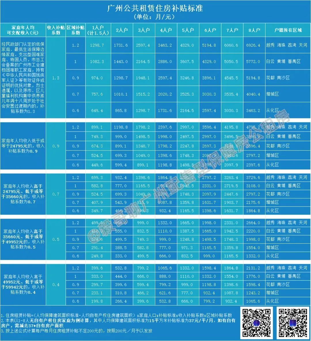 如果选择租赁补贴,每月能补贴多少钱,主要跟家庭年人均收入高低、家庭保障人口数、户籍所在区有比较大的关系,保障人口数在1-8人区间的补贴金额,可对照上表查看。