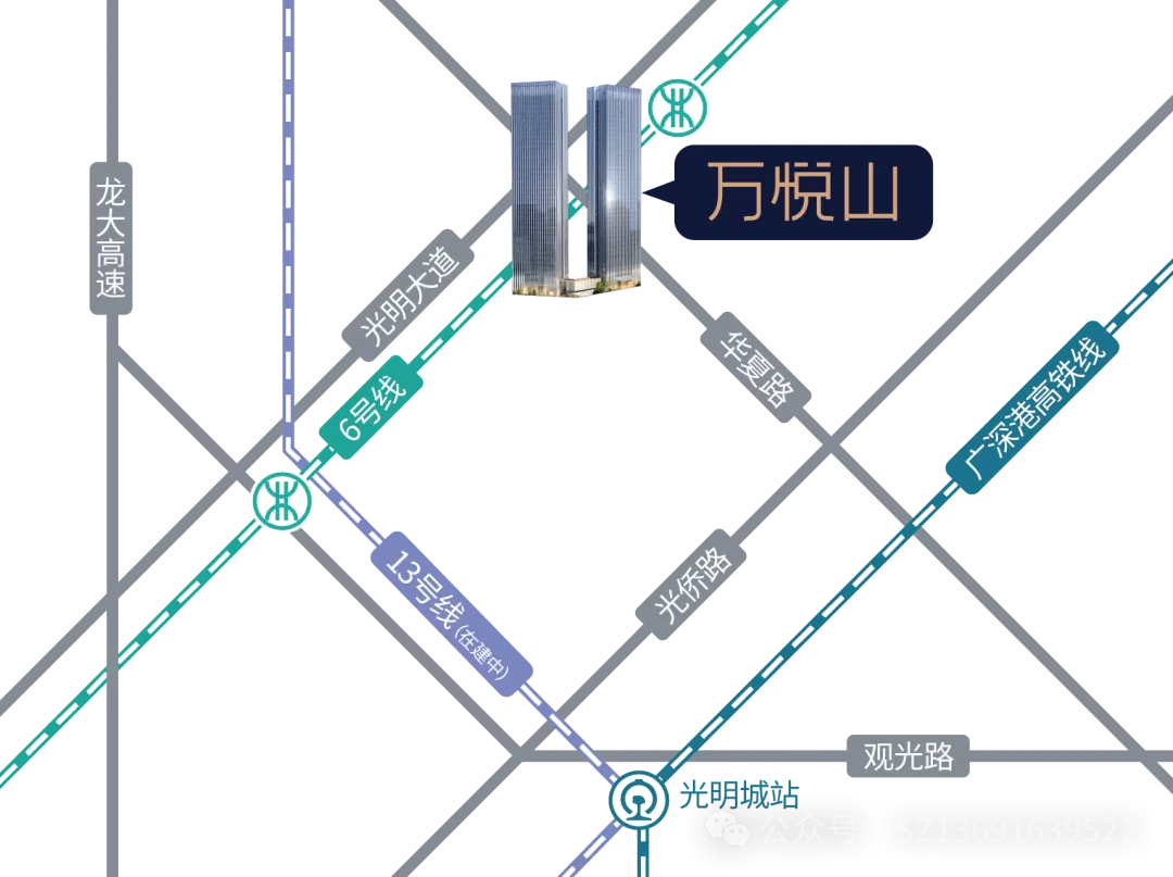 项目位于光明科学城规划光明中心区及产业转化区交汇,2公里范围内政务服务、商业配套密度更是集目前光明区之大成,未来依托双区发展,更享产城建设、科技发展和高端商务等多重升级红利。光明区政府、光明区行政服务大厅光明区发展改革局、光明区财政局等营商相关政务部门宏发万悦山大厦便利的交通: