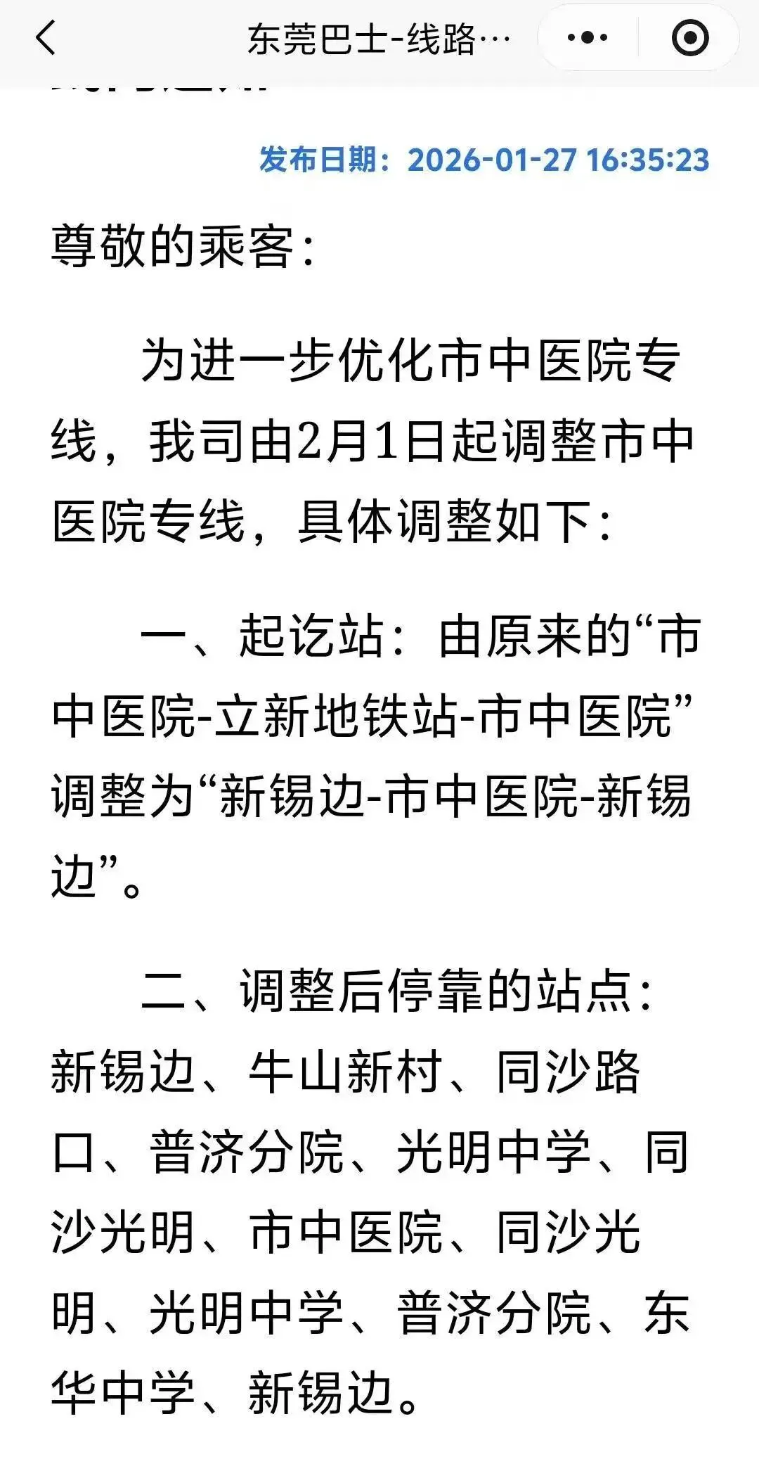 在立新地铁站公交站,记者看到只有一张“市中医院专线”的单线线路图直接贴在站牌外玻璃上,而这条“专线”并未出现在地铁站内的指引信息中。原来,“东莞巴士”小程序1月27日发布消息称,今年2月1日起,这条声称“直达医院、接驳地铁,解决出行‘最后一公里’”的接驳专线公交“市中医院专线”,调整后的线路将不再停靠立新地铁站。