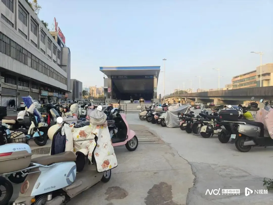 在曲海地铁站出站口,门口的空地停放着数十辆电动自行车。