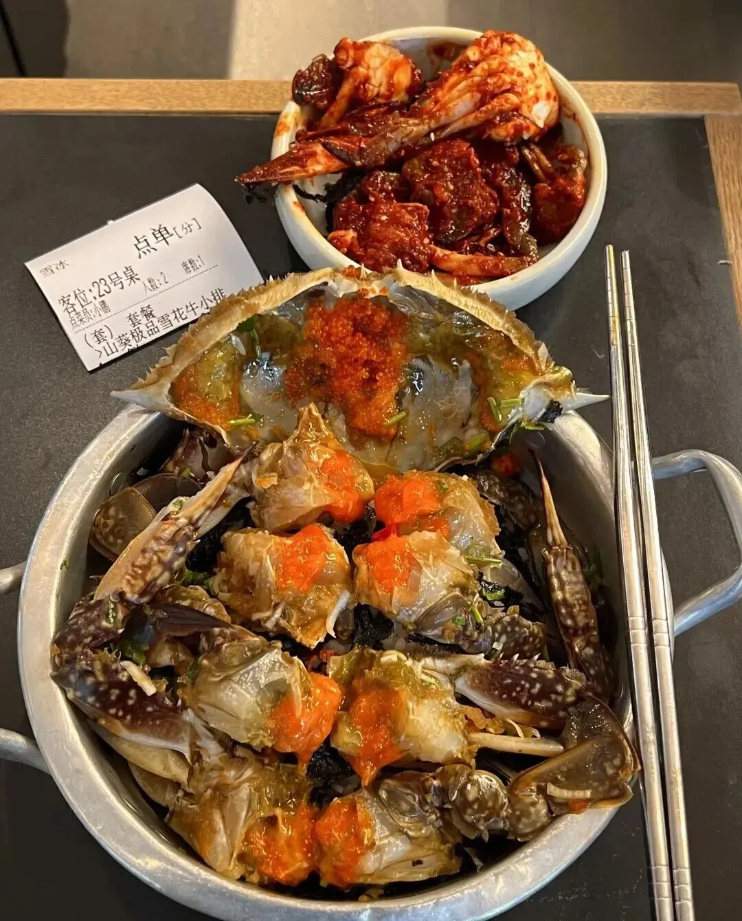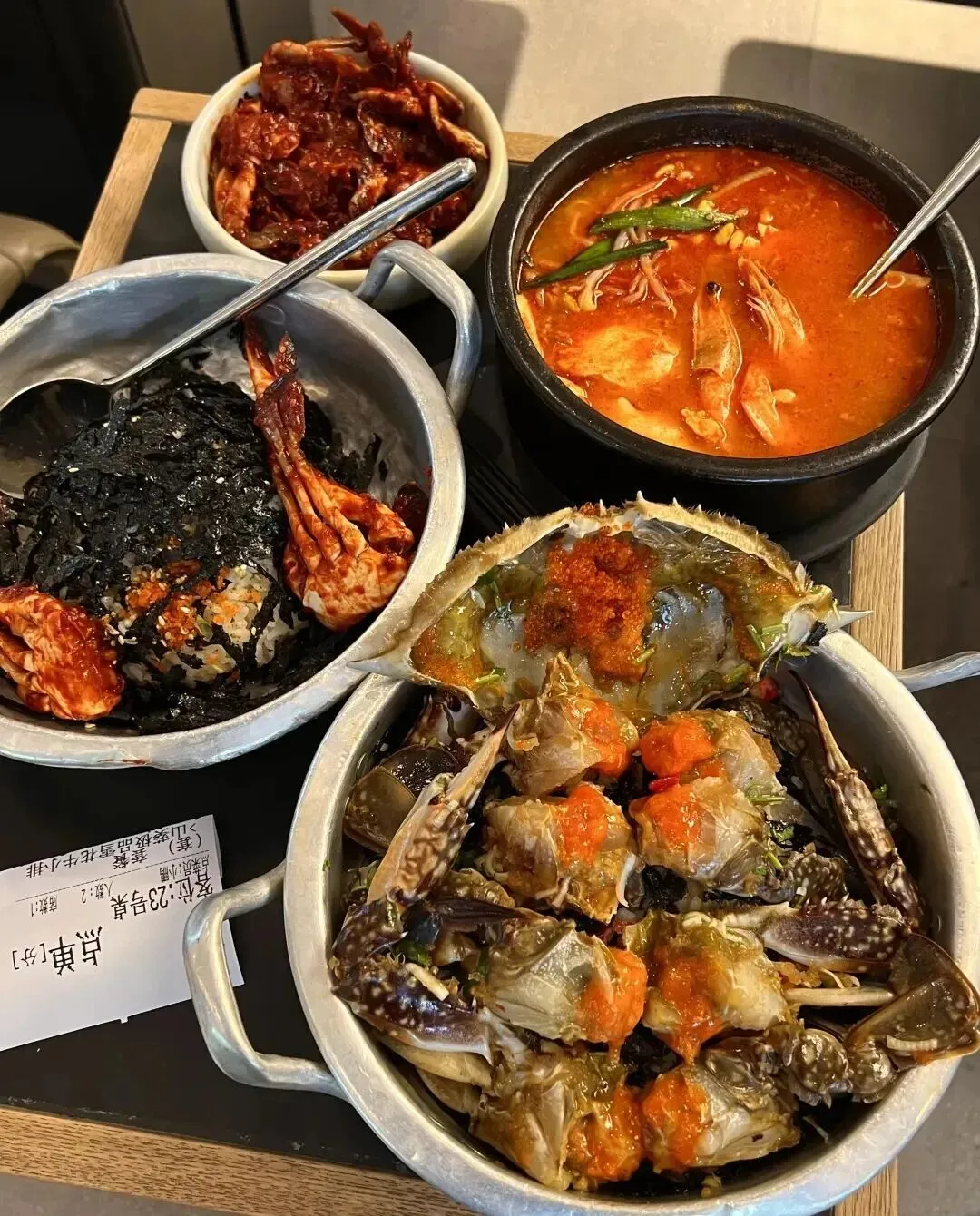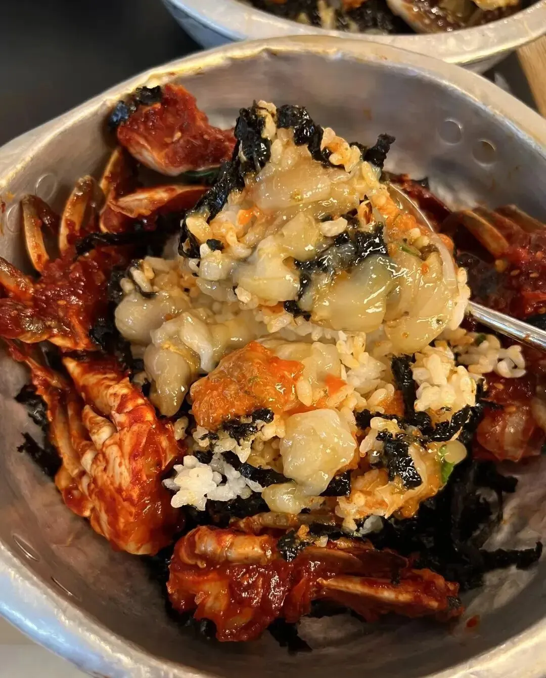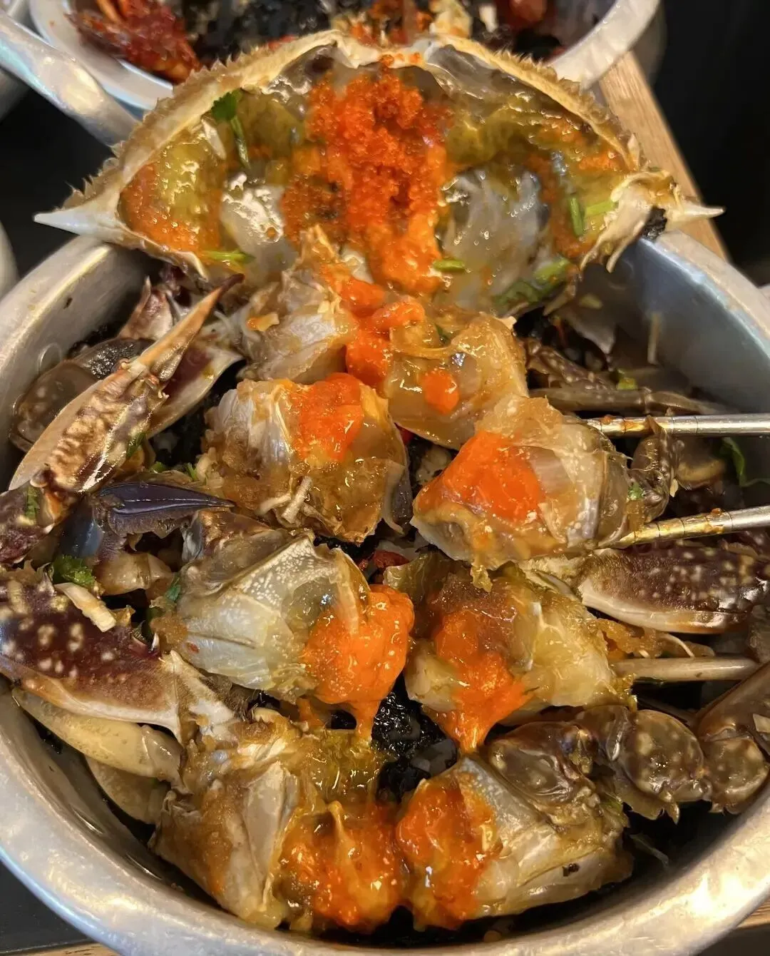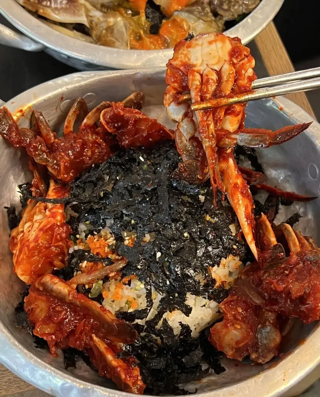 还有那个韩式辣酱蟹 , 微辣带甜 , 蟹肉被辣酱裹得红亮亮的 , 看着就让人流口水。
