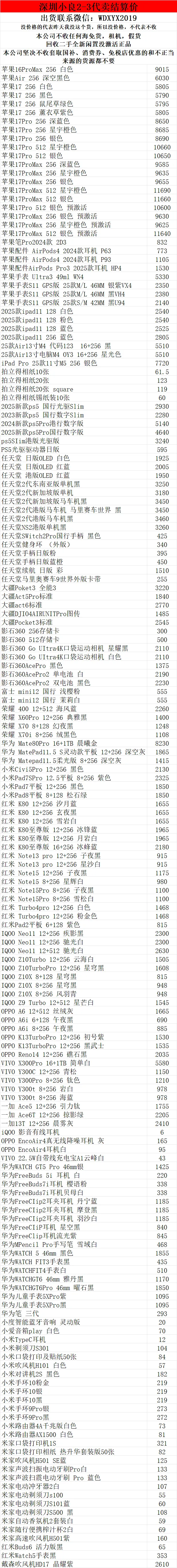 >深圳小良2026.2.3电子产品代卖结算价(美妆价格小程序查看)