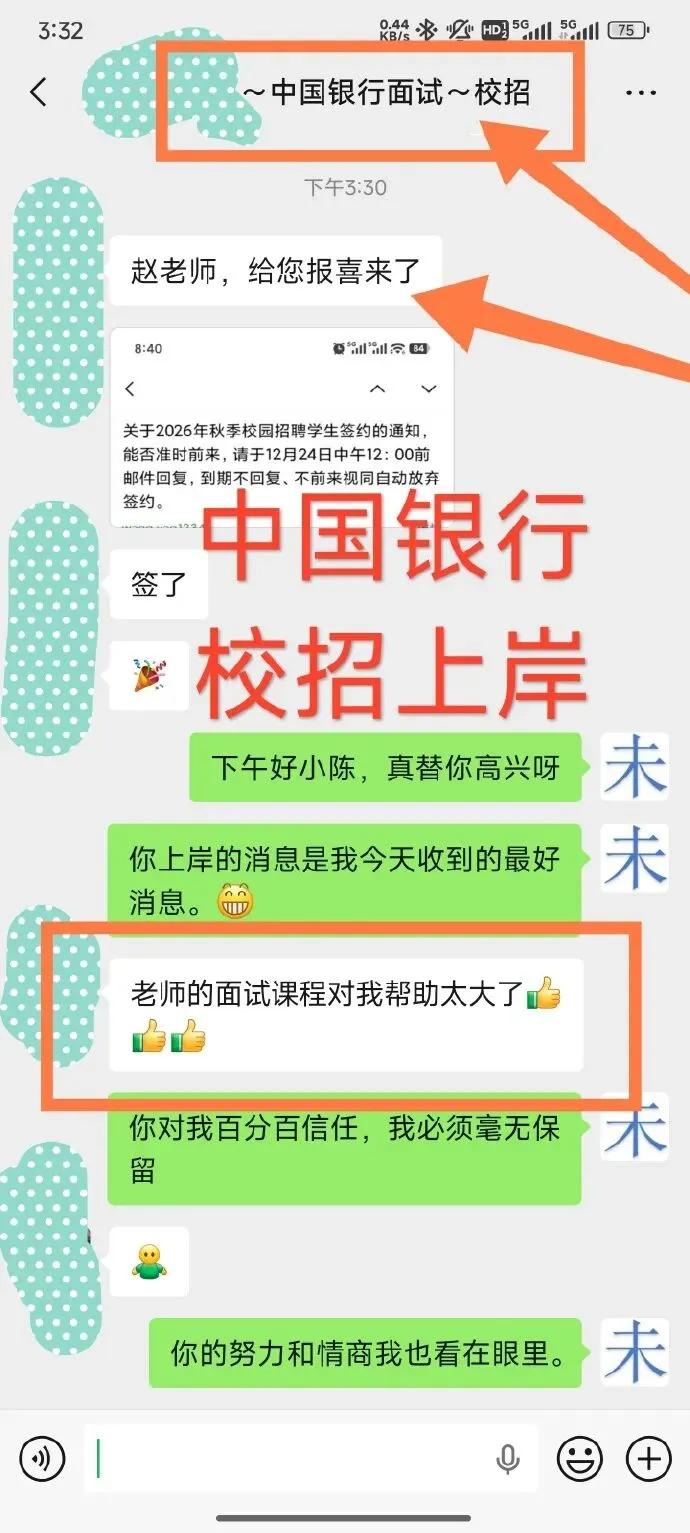 这位同学就读于一所普通二本院校的计算机相关专业。难得的是,他所在的中国银行河北分行前往其学校开展了校园招聘,并且提供了“按生源地优先分配”的宝贵机会,使他能够回到家乡工作。他作为工科生,此前没有任何面试经验,在表达能力上也不占优势。为此,我为他量身定制了十节面试辅导课程,系统地帮助他提升面试技巧与表达能力。最终,他成功通过了所有考核环节,于今日正式签约!👇黄河水利委员会上岸,沾沾喜气👇