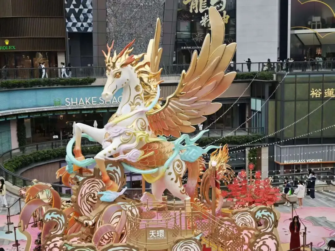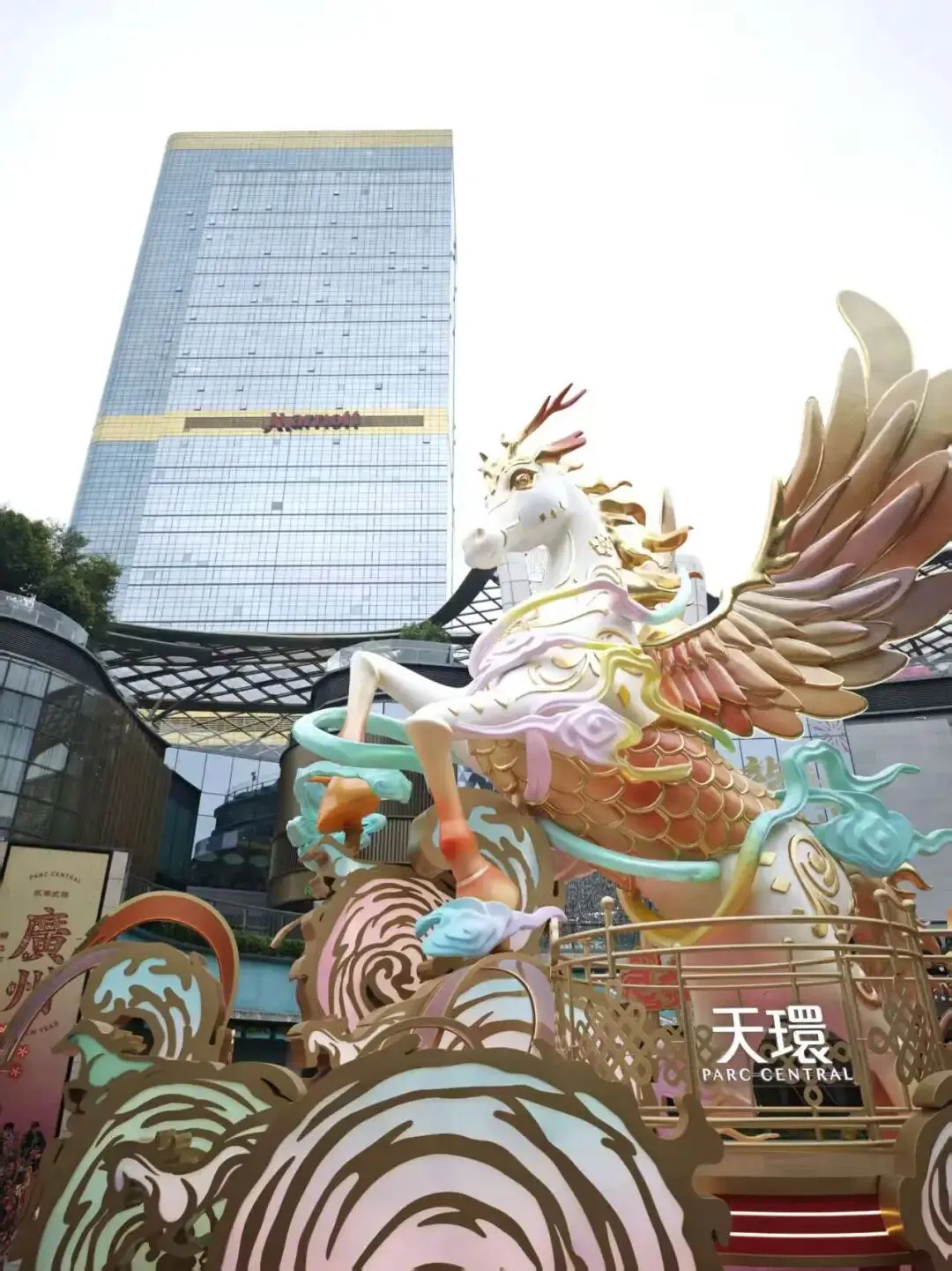 新春伊始,广州天环Parc Central为大家带来了一场寓意吉祥、年味十足的“龍馬精神”新春特展!这不仅是一场视觉盛宴,更是亲子家庭春节遛娃、感受广府文化的绝佳去处。快跟着我们一起,探秘这只“含金量”超高的瑞兽,沾沾喜气,开启一整年的好运吧!在天环B1户外广场,一只高达 10.88米 的巨型龍馬傲然屹立,它马身龙鳞,背生双翼,祥云环绕,仿佛从中国古代神话中穿越而来。这不仅象征着十全十美、事业兴旺,更承载着“龍馬精神”的奋进寓意。最令人惊叹的是,龍馬全身披覆着 12,000片24K金箔,在阳光下熠熠生辉,金光闪闪,绝对是春节期间最“壕”的打卡点!细看龍馬,你会发现它身上巧妙融入了木棉、祥云、鳞纹等富有传统广府韵味的图腾,每一处都流露出浓厚的岭南风情。而那 168片龙鳞 更是熠熠生辉,寓意着新的一年“一路发”,财源广进!别忘了,在龍馬周围,还有 16匹大小不一的骏马 踏浪相随,找到它们,寓意着新的一年必定“马到成功”!这绝对是孩子们最喜欢的寻宝环节,快带上萌娃一起去发现吧!户外大楼梯摇身一变,成为了一个充满魅力的 广府非遗大舞台!这里不仅有头戴锦绣粤剧凤冠的装置,让你可以体验一把“为新岁加冕”的仪式感;还有迷你梅花桩,可以和南狮一起献联,感受好运滚滚而来。在“廣州”剪纸墙跟前落座,与手工艺精髓同框,拍下充满艺术感的全家福。夜幕降临,由 988片桃瓣组成的光影桃花树 更是美轮美奂,寓意着花开富贵,共同构成了一幅满庭吉庆的广府文化画卷,让孩子们在玩乐中也能感受传统文化的魅力。在B1户外(近POP MART)的扶梯下方,天环巧妙地打造了一个仿似家中厅堂的温馨场景。在这里,你可以和家人朋友围坐一堂,拍下一张张充满爱意的 团圆全家福。更贴心的是,这里还设有 毛孩子专属窝,让家里的“毛孩子”也能钻进去,一同贺岁,享受节日的欢乐!据说还有返场彩蛋等你发现哦,带着好奇心去探索吧!别忘了直上L3天台花园东区,漫步于 浪漫的桃花林 之中。这里福运满枝,花开富贵,不仅能让你大展“红桃”,收下整年的财运事业运,还能一览广州的城市天际线,感受春日的美好与活力。在桃花树下,许下新年的愿望,和孩子一起留下美好的回忆。看过龍馬,马年必成为龍馬!天环祝你一马当先,昂首向前,捞乜都掂!快带上你的家人,一起来天环Parc Central,感受这场超高含金量的“龍馬精神”新春特展,开启一个充满活力和好运的新年吧!地点: 天环Parc Central (🚇1/3号线体育西路站B出口)- 周五、周六及年廿八-年初七节假日 🕦10:00-22:30
