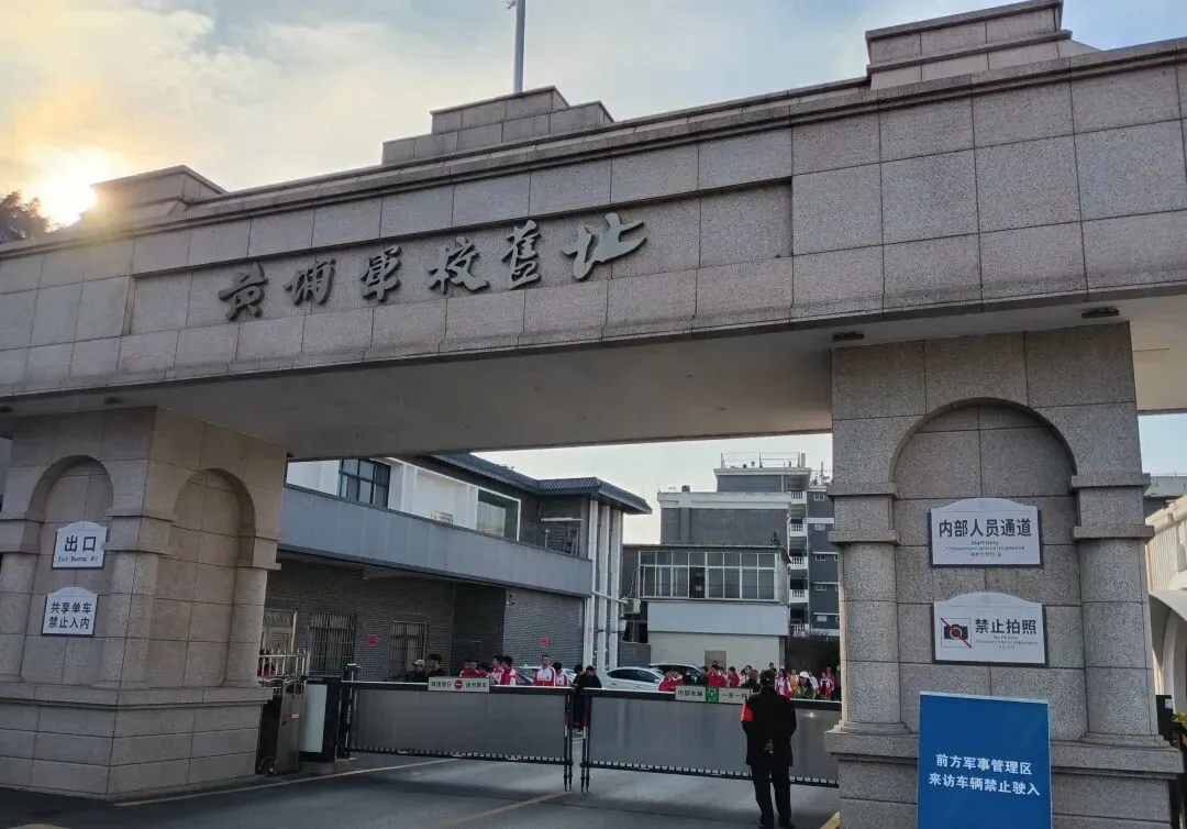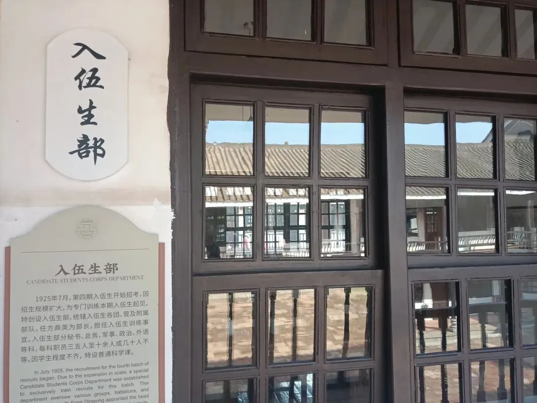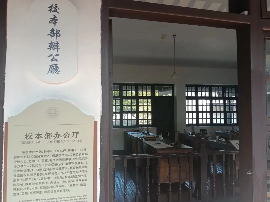军校大门坐南向北,面临珠江,在牌坊门额上书有白底黑字的“陆军军官学校”横匾,是国民党元老谭延闿的手笔。门前有两个哨岗,后面的两间房子是卫兵室。