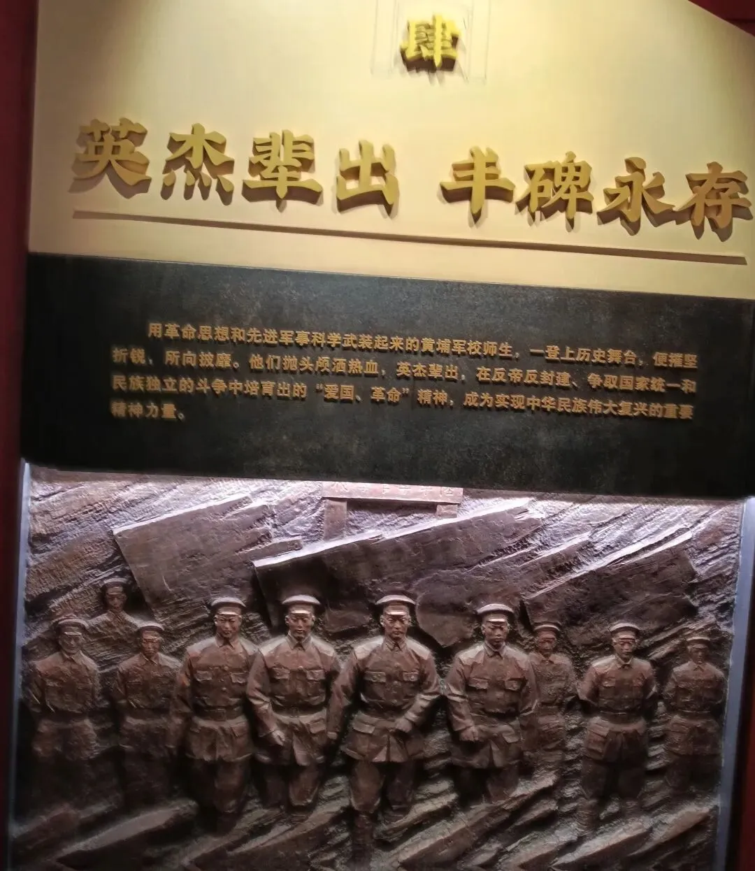 黄埔军校建立时,门口一副对联曰:“升官发财,请往他处;贪生怕死,勿入斯门”,横额为“革命者来”。孙中山逝世后改为总理遗嘱中的“革命尚未成功,同志仍须努力”。