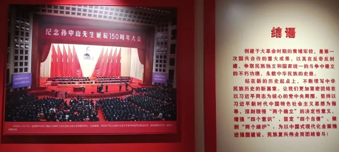 1921年12月,共产国际代表马林在广西桂林向孙中山提出“创办军官学校,建立革命军”的建议。1924年,国民革命风起云涌,国共两党首度携手合作,孙中山先生视“教育为神圣事业,人才为立国大本”,在中国共产党和苏联的帮助下,在广州亲手创办了一文一武两所学堂——“国立广东大学”(今中山大学)和“中国国民党陆军军官学校”。因后者校址设在广州东南的黄埔岛,简称黄埔军校。 军校成立后,蒋介石为校长,廖仲恺为国民党党代表,任李济深、邓演达为教练部正、副主任,王柏龄、叶剑英为教授部正、副主任;戴季陶(后为周恩来)、周恩来为政治部正、副主任,何应钦为总教官。此外还有熊雄、恽代英、萧楚女、聂荣臻、张秋人等共产党人担任教官及各方面负责工作。 建立军校的目的是为国民革命训练军官,孙中山先生希望通过创建革命军,来挽救中国的危亡。在开学典礼上曾致词:“我们开办这个学校,要用里面的学生做根本,成立革命军,诸位就是将来革命军的骨干。创立了革命军,我们的革命才能成功。” 1924年5月,从1200名考生中正式取录学生350名,备取120名。5月5日开始入学。 6月16日,举行陆军军官学校开学典礼,孙中山到会场给青年作了热情洋溢的讲话:“要从今天起,立一个志愿,一生一世,都不存在升官发财的心理,只知道做救国救民的事业。”孙中山还宣布训词:“三民主义,吾党所宗, 以建民国,以进大同, 咨尔多士,为民前锋, 夙夜匪懈,主义是从, 矢勤矢勇,必信必忠, 一心一德,贯彻始终”, 此训词由陈祖康谱曲后成为校歌和国民党党歌。 平定商团叛乱是黄埔军校建校以来的第一战。1924年秋,英国汇丰银行广东分行买办陈廉伯在英帝国主义支持下组织反动武装商团军,自任总长,策划商团军叛乱,妄图推翻革命政权。孙中山平定了商团叛乱。