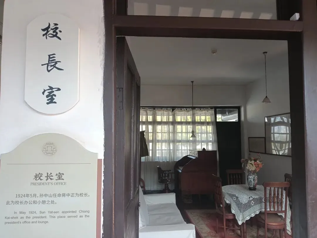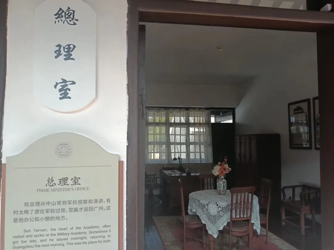 黄埔军校总理孙中山的总理室设在走马楼二楼,最初是孙中山在军校办公休息的场所。室内摆设比较简单,房间中央有一张圆桌,桌上铺着白色的桌布,摆着一瓶花。北面的窗前,置有一张办公桌,南面的窗边,则是为孙夫人宋庆龄准备的梳妆镜。 1928年11月,在校园南面八卦山上建立孙中山纪念碑。1930年在纪念碑顶上竖立孙中山铜像。纪念碑的造型独具匠心,利用两边交叉而上的阶梯及铜像,构成“文”字,暗含了孙文的意思。碑座正面刻有军校校训“亲爱精诚”四个大字。