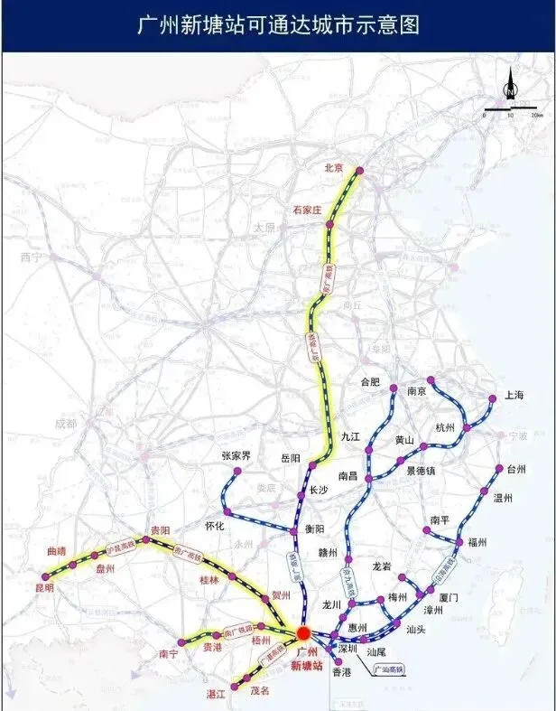 流量基础增强:新塘站接入广汕高铁、穗深城际、广深铁路等线路,连接粤东、长三角及大湾区核心城市,极大提升了广州东部的可达性,初步成为区域性客流、物流节点。