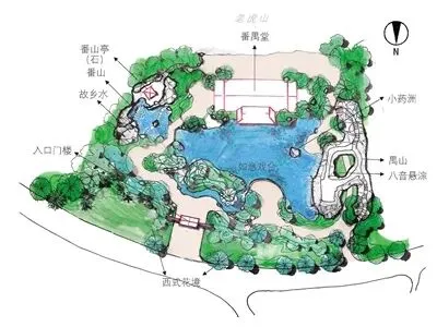 广州园地势较为平坦,局部微地形起伏,北望仙湖,南背靠老虎山,山上有郭公阁。入口迎宾区,浪漫花境与岭南门墙构成“软边界”。