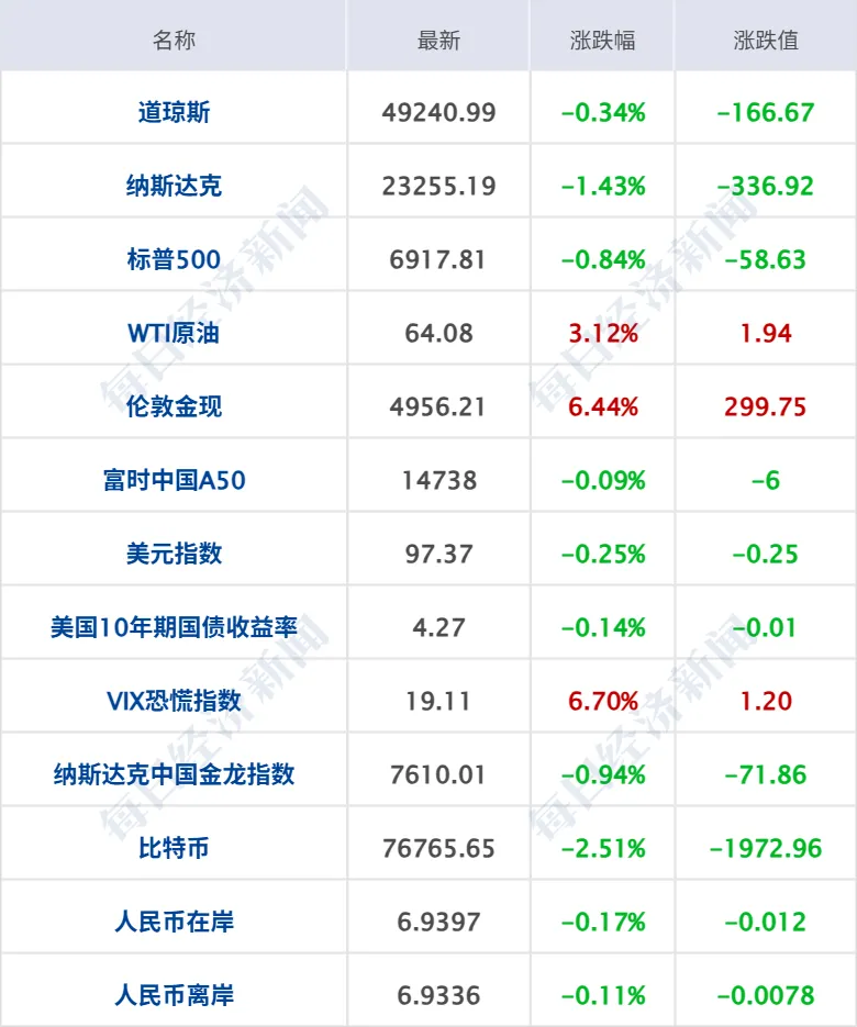 美股三大指数集体收跌,道指跌0.34%,纳指跌1.43%,标普500指数跌0.83%,热门科技股普跌,博通跌超3%,微软、英伟达、Meta跌超2%;稀土概念、有色金属、贵金属涨幅居前,黄金资源涨超20%,南方铜业涨超11%,美洲白银公司涨超8%,泛美白银涨超5%;应用软件、加密货币、减肥药概念股跌幅居前,诺和诺德跌超14%,Coinbase、Circle跌超4%,礼来、辉瑞跌超3%。纳斯达克中国金龙指数跌0.94%,中概股多数下跌,哔哩哔哩跌超4%,阿里巴巴、百度跌超2%,京东、爱奇艺跌超1%,小鹏汽车涨超4%,理想汽车涨近3%。