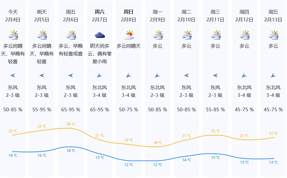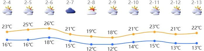 预计2月11-28日我市气温偏高、降雨偏少,主要有3次左右冷空气过程:中旬前期、中旬后期和下旬中期,期间可能伴有7级左右冷空气大风和阶段性的雨雾天气,最低气温10℃左右。