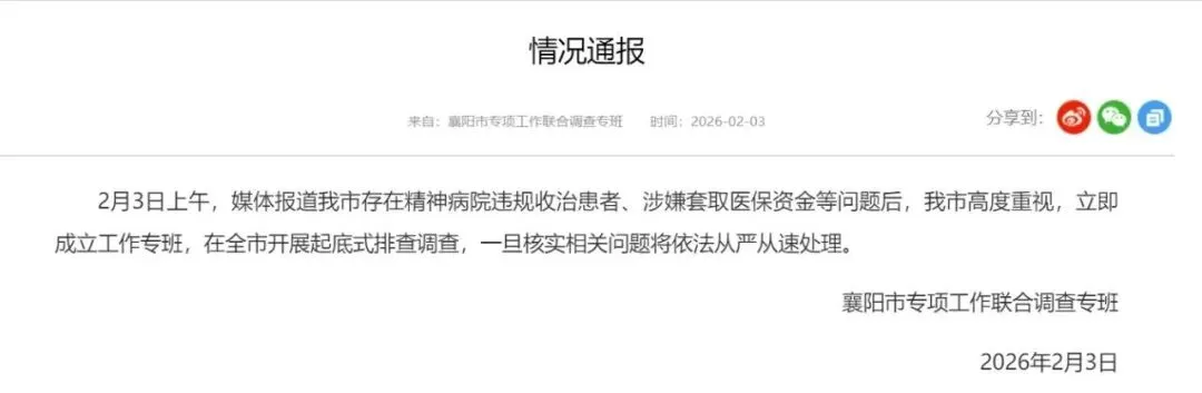● 湖北襄阳多家精神病医院被曝骗保,医院护工保安也成“精神病人”,虐待惩罚病人最久绑3天3夜。官方通报:立即成立工作专班。详情>>