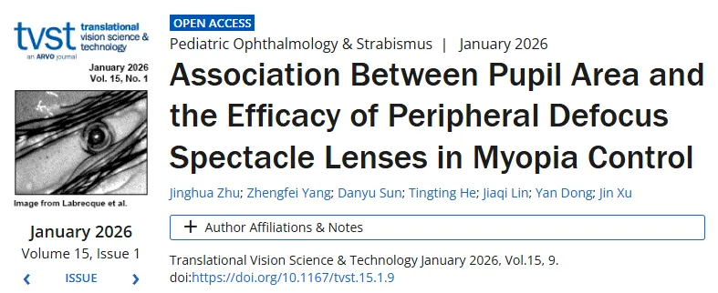 Zhu J, Yang Z, Xu J, et al. Pupil area may influence the efficacy of peripheral defocus spectacle lenses for myopia control in children: a retrospective study. Transl Vis Sci Technol. 2026;15(1):9.