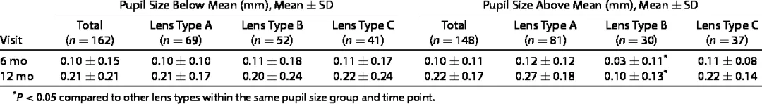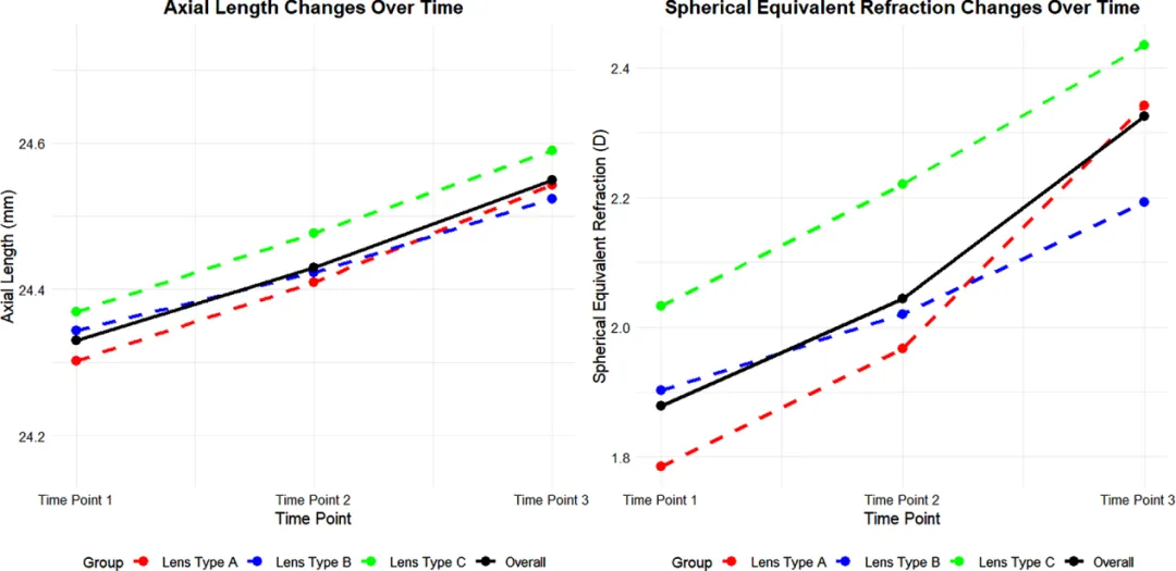 该趋势在12个月时仍显著,B型镜片组的AL增长仍为最低(0.10 mm),显著低于A型镜片组(0.27 mm)和C型镜片组(0.22 mm)。