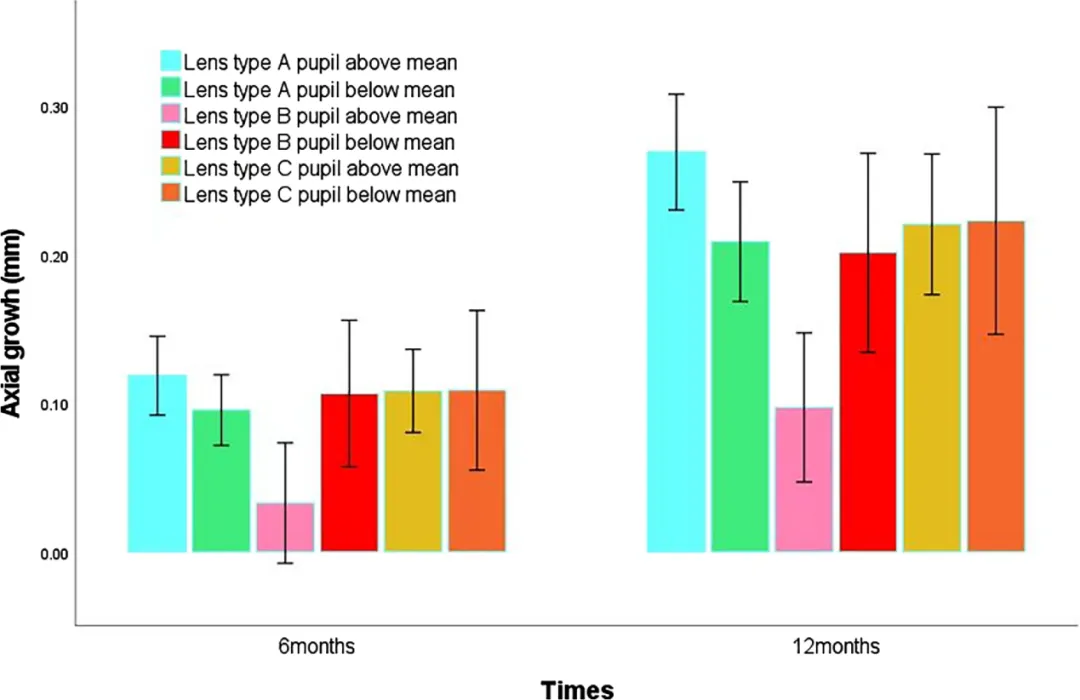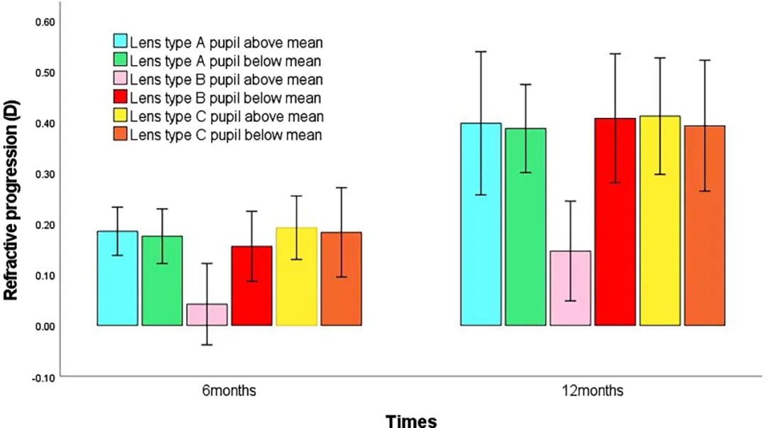 最终形成6个亚组(2个瞳孔面积分组×3种镜片类型),用于对比眼轴增长及近视进展情况。所有受试者均接受睫状肌麻痹全矫配镜,处方为周边离焦框架眼镜,并医嘱全天佩戴;每次复诊时核查佩戴依从性。分别于基线、配镜后6个月、12个月收集受试者的眼轴长度及屈光数据,通过比较不同瞳孔面积亚组的眼轴增长量与等效球镜度数进展量,评估不同设计镜片的近视控制效果。