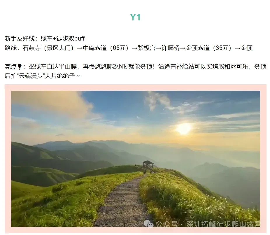 ✅ 新手友好无压力:三条神仙路线任选,缆车 + 徒步双 buff,最慢 2 小时登顶,全程有补给站(烤肠冰可乐续命),6-60 岁健康人群都能冲!