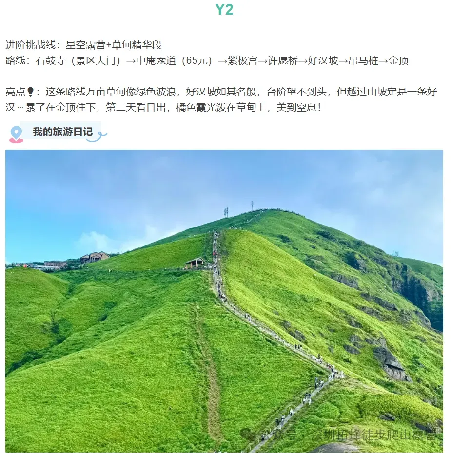 金顶(76% 人必冲):1918 米海拔 “武功山 C 位”,云海翻腾如巨龙,日出时分人潮再挤也值得 —— 站在山顶拍 “云端漫步”,朋友圈点赞直接爆掉!观音宕(星空党狂喜):人流量少于金顶,星空营地视野无遮挡,晚上躺在帐篷里看银河,早上被第一缕阳光叫醒,浪漫到想原地封神!吊马桩(草甸精华段):到金顶的最美环线,草甸连绵如绿色波浪,每一步都是壁纸级风景,徒步累了随手拍都是 “闯入宫崎骏动画” 既视感~🚶♀️ 三条路线,新手 / 进阶 / 硬核党全拿捏