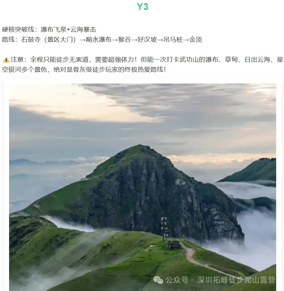 👉 亮点:全程徒步无索道,体力王者专属!一次打卡瀑布、草甸、日出、云海、星空,朋友圈 “卷王” 就是你~(体力预警:需超强耐力!)
