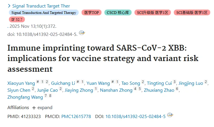 本研究发现原型株疫苗及早期突破感染维持原型株主导的免疫应答,BA.5 适配疫苗可使免疫印记向 XBB 转移。研究确定 XBB 的 50% 保护性 NAb 滴度阈值为 NT₅₀=12.6,该阈值与后续 XBB、JN.1 流行强度直接相关,为疫苗策略优化和变异株风险评估提供了重要依据。