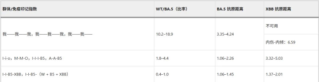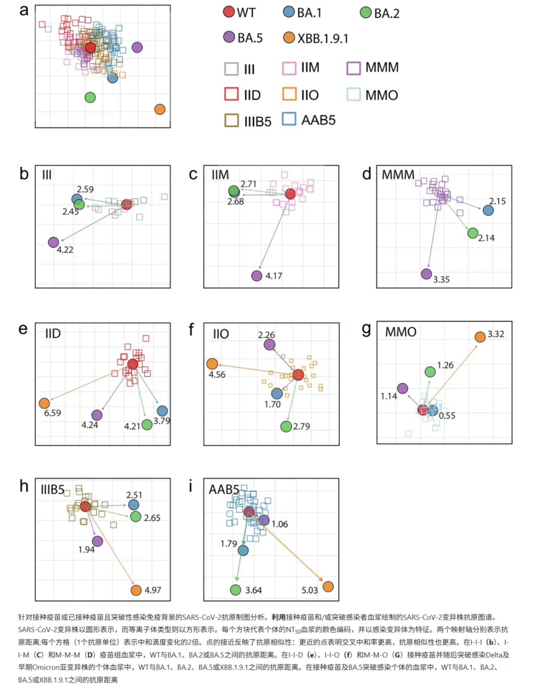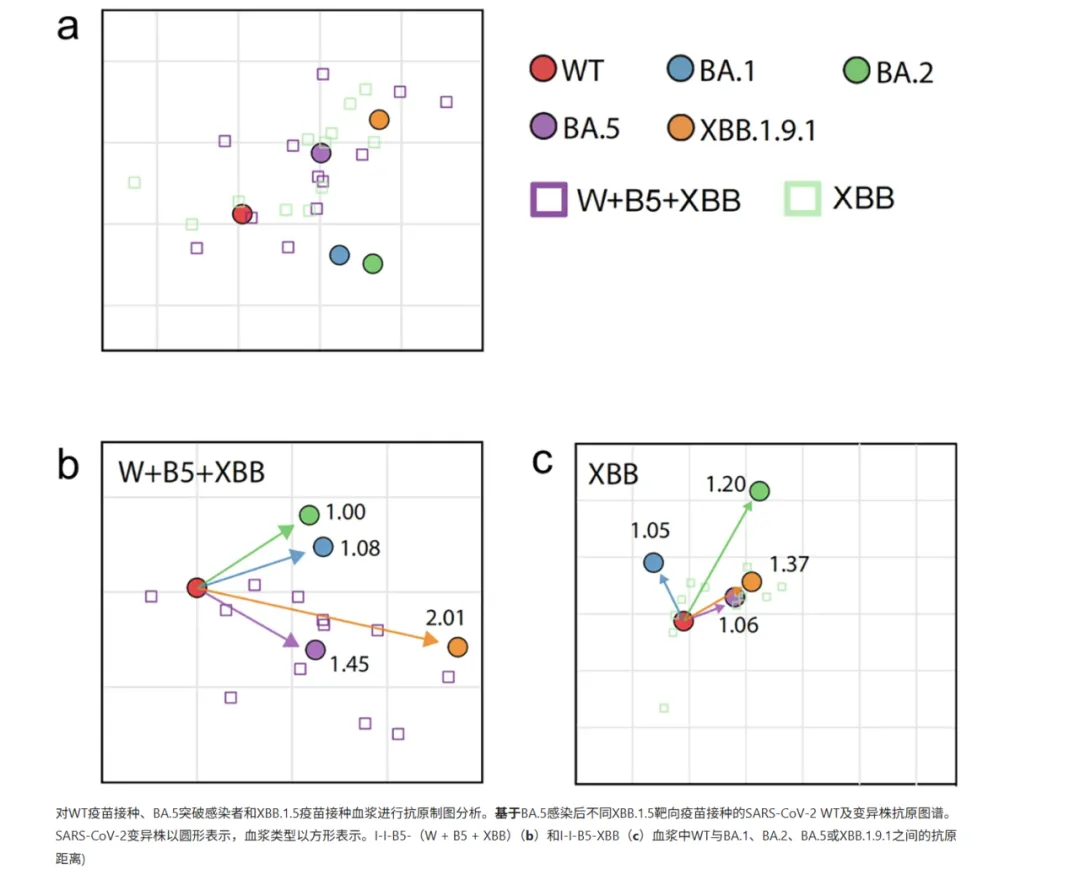 大规模疫苗接种 / 感染影响免疫印记,有免疫背景人群感知抗原距离更短。本研究经 MDS 构建抗原图谱发现,奥密克戎突破感染及 BA.5→XBB 连续暴露,会显著缩短 WT 与 BA.5 抗原距离,XBB 靶向接种也大幅缩短 WT 与 XBB 距离,且 XBB.1.9.1 与 WT 固有抗原距离最大。
