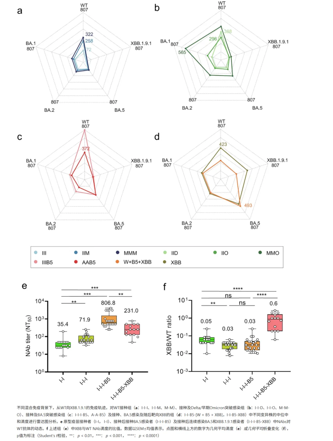 BA.5 感染后接种 XBB.1.5 疫苗(单价 / 三价重组蛋白)重构中和谱,使抗体中心转向 BA.5 和 XBB.1.9.1;WT 特异性 NAb 滴度随免疫暴露逐步升高,在 I-I-I-B5 达峰值,经 BA.5+XBB 连续暴露后显著下降约 4 倍。XBB.1.9.1/WT NAbs 比值在该连续暴露组骤升至 0.6,证实 XBB 靶向免疫推动群体免疫从祖先株印记向奥密克戎适配型抗体景观转变,说明高抗原分歧变异体可突破原有抗原资历,XBB 谱系抗原是克服历史免疫印记的关键,对大流行防控意义重大。