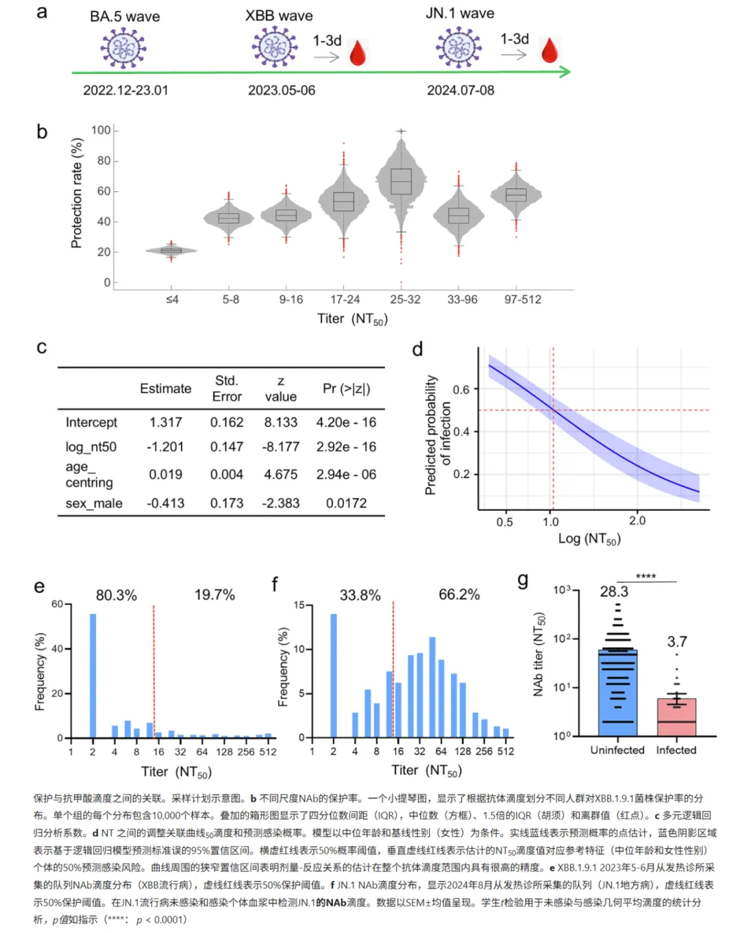 群体分析显示 80.3% 研究对象 XBB.1.9.1 滴度低于保护阈值(NT50=12.6),与 68.6% 的感染率相符;2024 年 7-8 月监测证实该阈值对 JN.1 同样有效,其滴度达标者占 66.2%,发热人群感染率仅 9.1%,且 JN.1 感染病例的几何平均滴度较未感染组低 7 倍以上,印证该阈值对奥密克戎变异株具有普遍适用性。