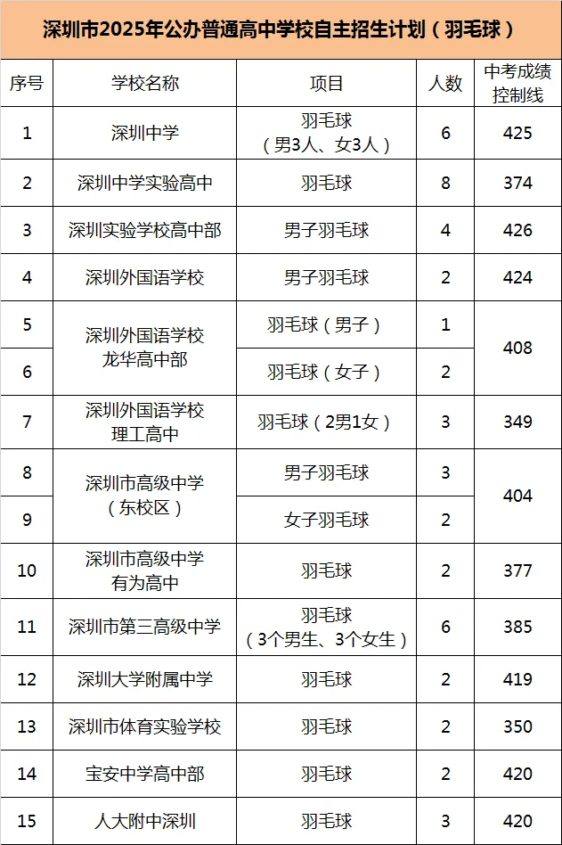 深圳市2025年公办普通高中学校羽毛球特长生招生学校有深圳中学、深圳中学实验高中、深圳实验学校高中部、深圳外国语学校、深圳外国语学校龙华高中部、深圳外国语学校理工高中、深圳市高级中学(东校区)、深圳市高级中学有为高中、深圳市第三高级中学、深圳大学附属中学、深圳市体育实验学校、宝安中学高中部、人大附中深圳,一共15所学校,计划招生人数48人。
